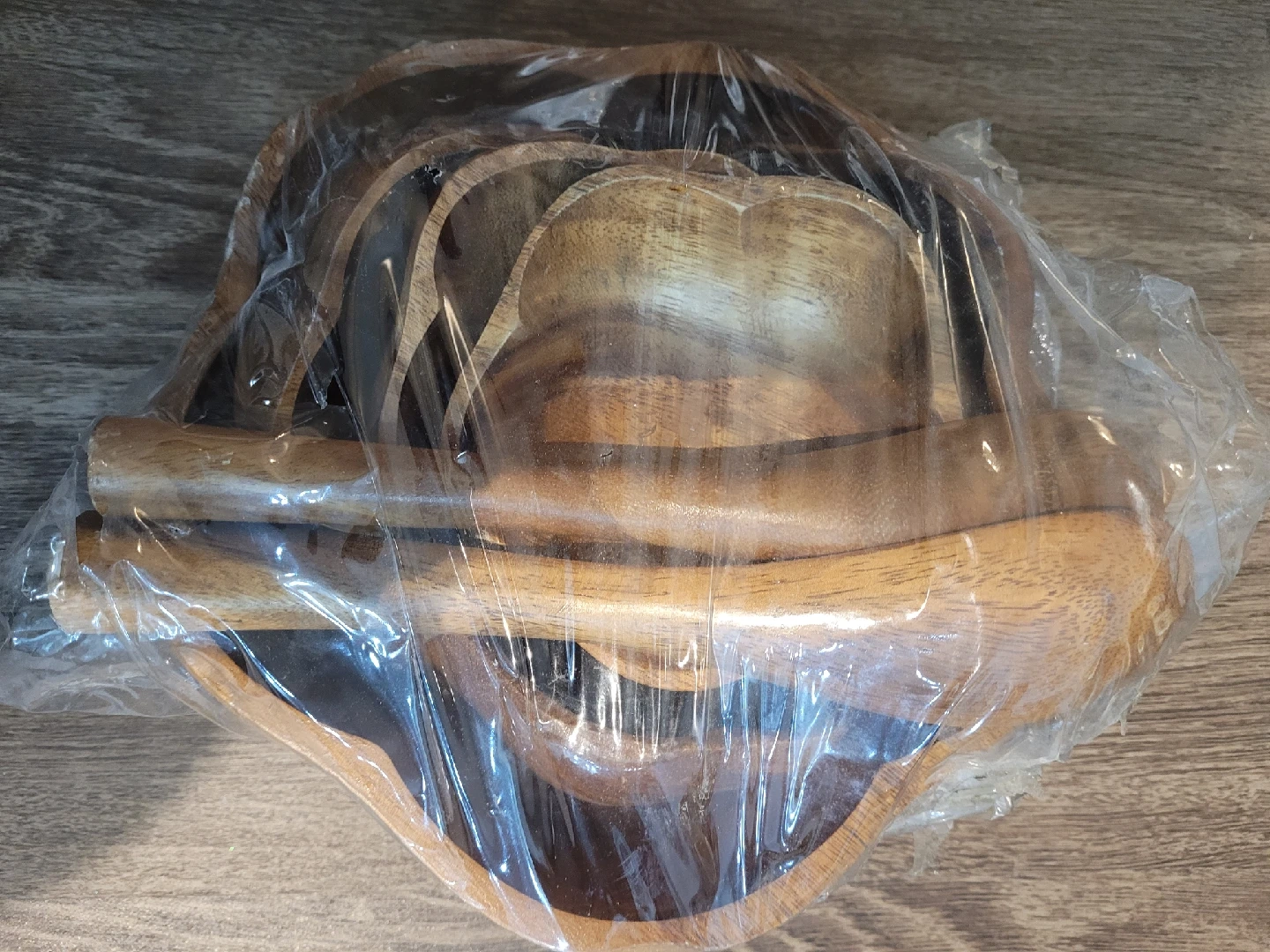 15I'm selling a brand new acacia wood salad bowl set! The set is still sealed in its original packaging. Perfect for adding a touch of natural elegance to your dining table