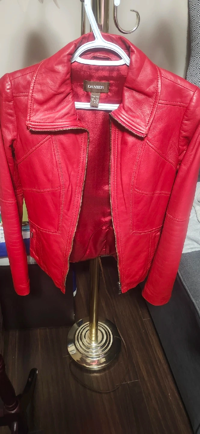10Here's a stylish Danier red leather jacket. It's in great condition and ready for a new home! Perfect for adding a pop of colour to your wardrobe I have the garmet bag I will put it in to protect the jacket