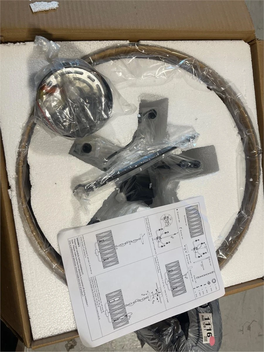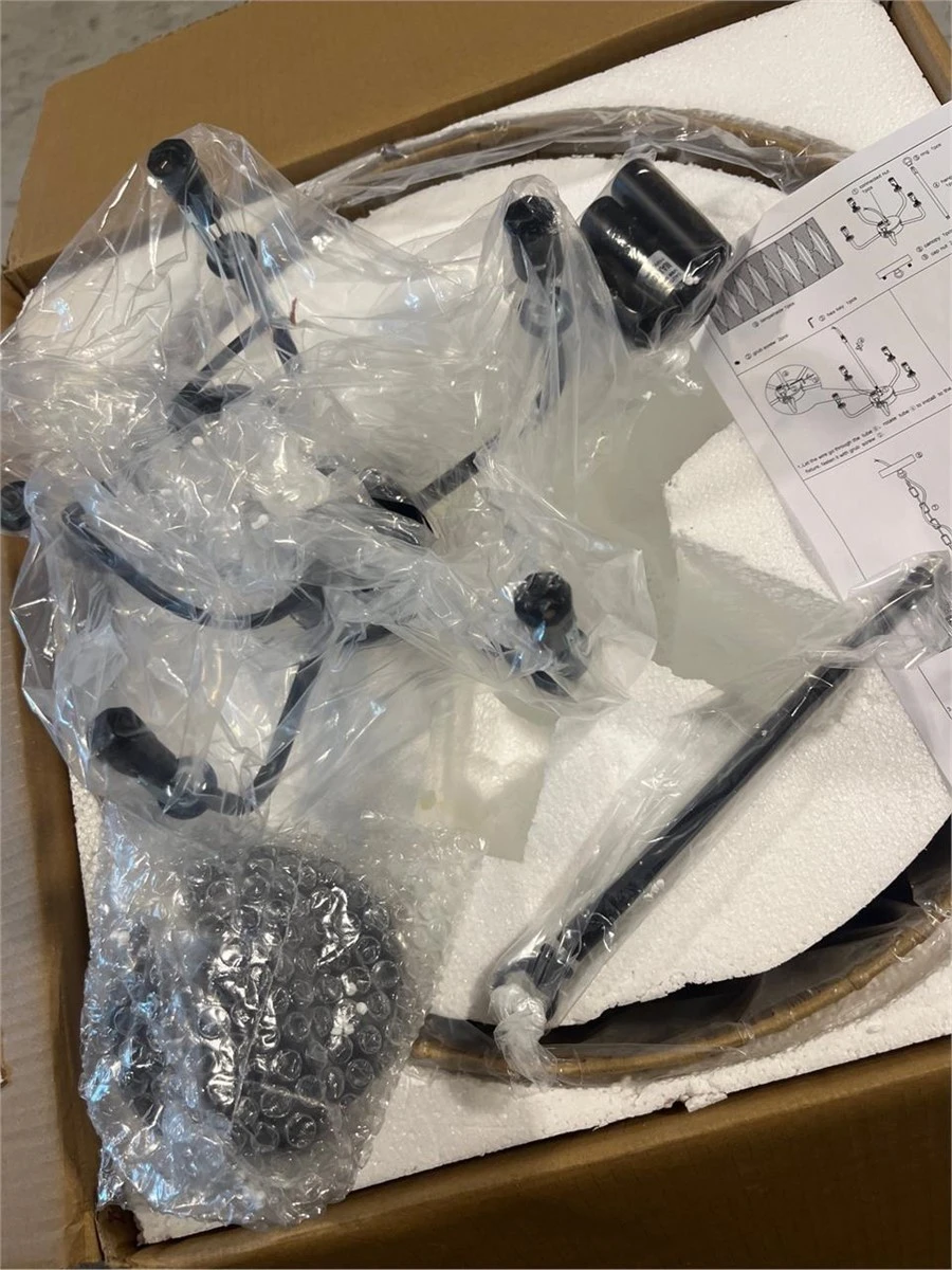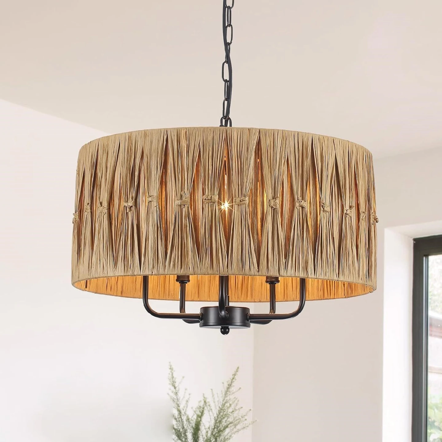 Brand new natural rattan drum chandelier! It features 5 x E12 base bulbs and is adaptable for sloped ceilings. The shade is made of 100% natural rattan. Comes with the original box and all components.