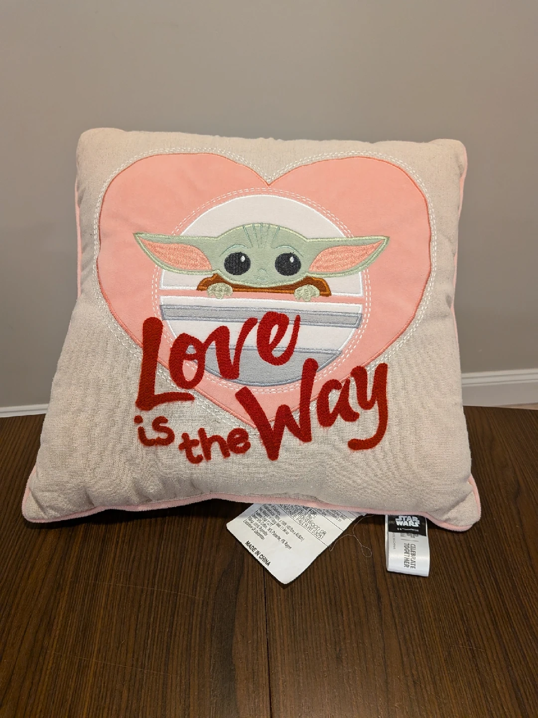 Add a touch of The Mandalorian charm to your home with this adorable Baby Yoda pillow! The pillow features a cute design with 'Love is the Way' embroidered on it. It's made of 100% Polyester with Rayon details. Perfect for any Star Wars fan!