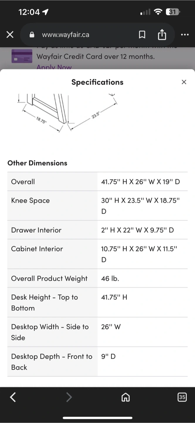Selling a drop-down desk! It features a spacious drop-down surface and generous cabinet storage. Dimensions are 26" wide, 41.75" high, and 19" deep