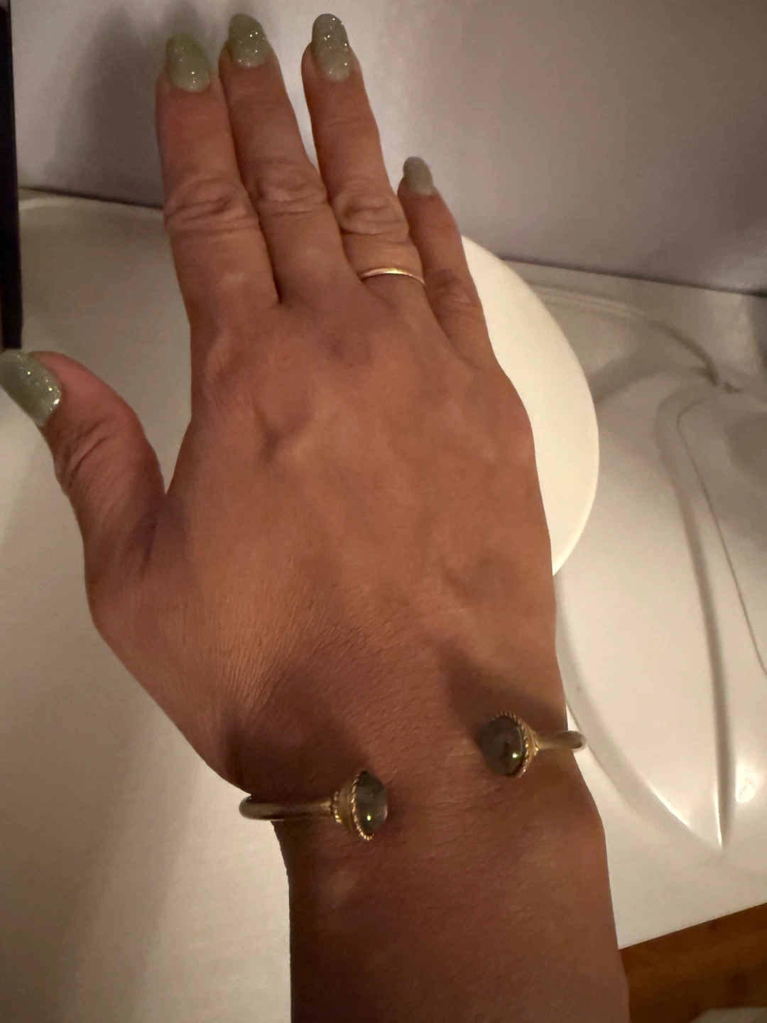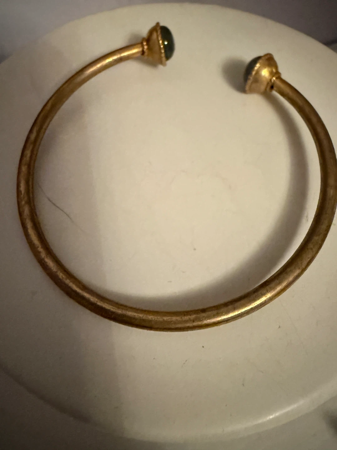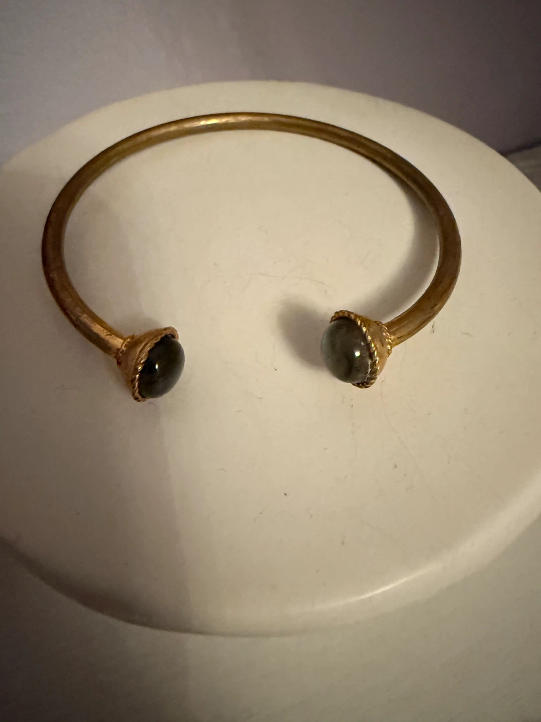 Selling a simple gold tone cuff bracelet. It's a stylish piece that's easy to wear and goes with just about anything. The bracelet features stone accents on each end. It's in good condition and ready for a new home!