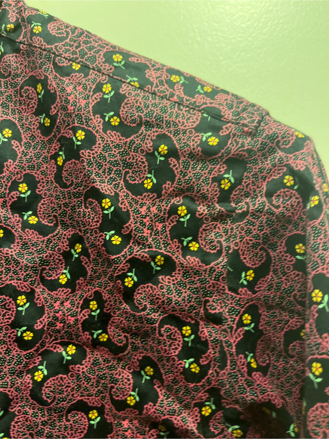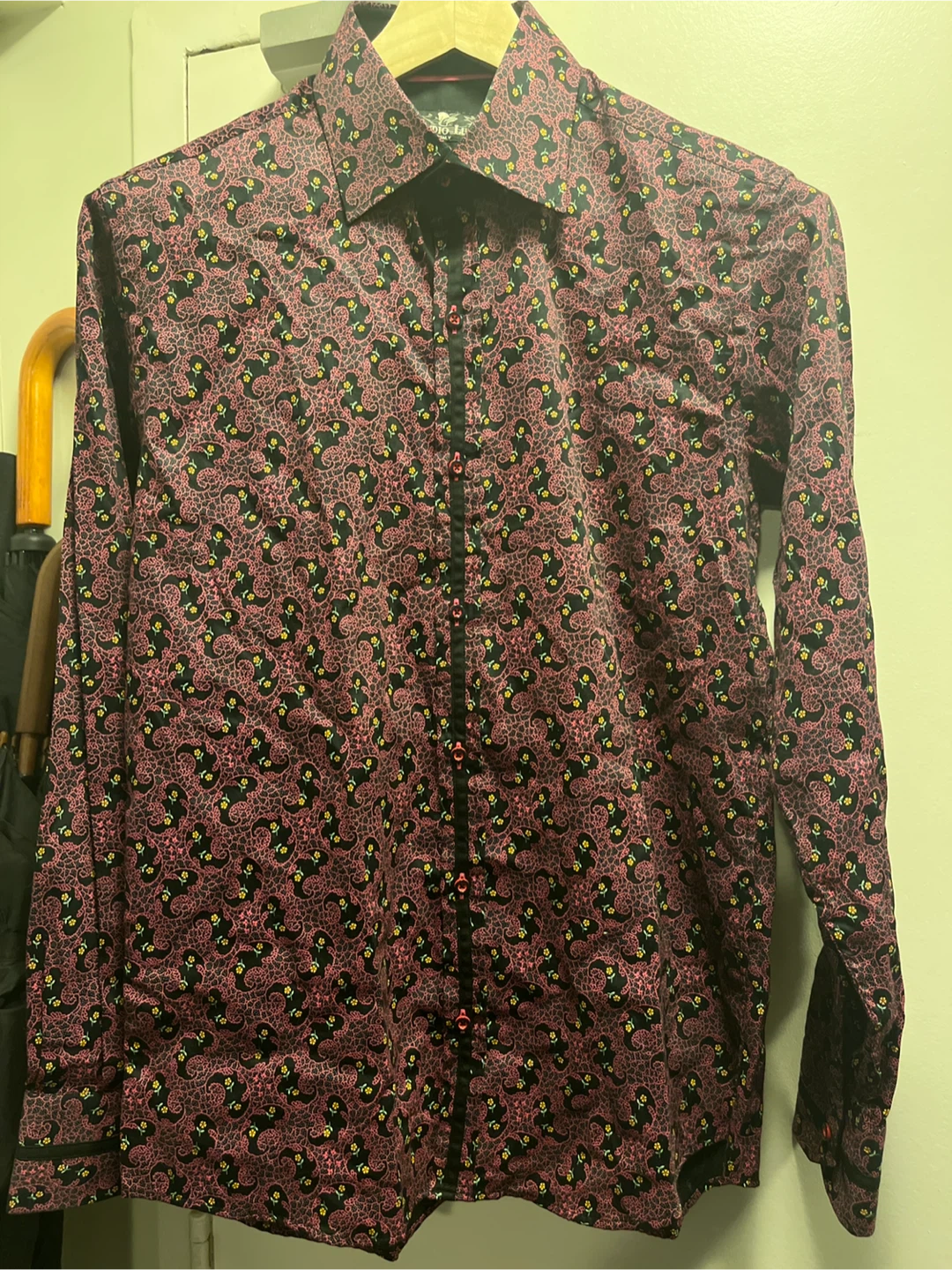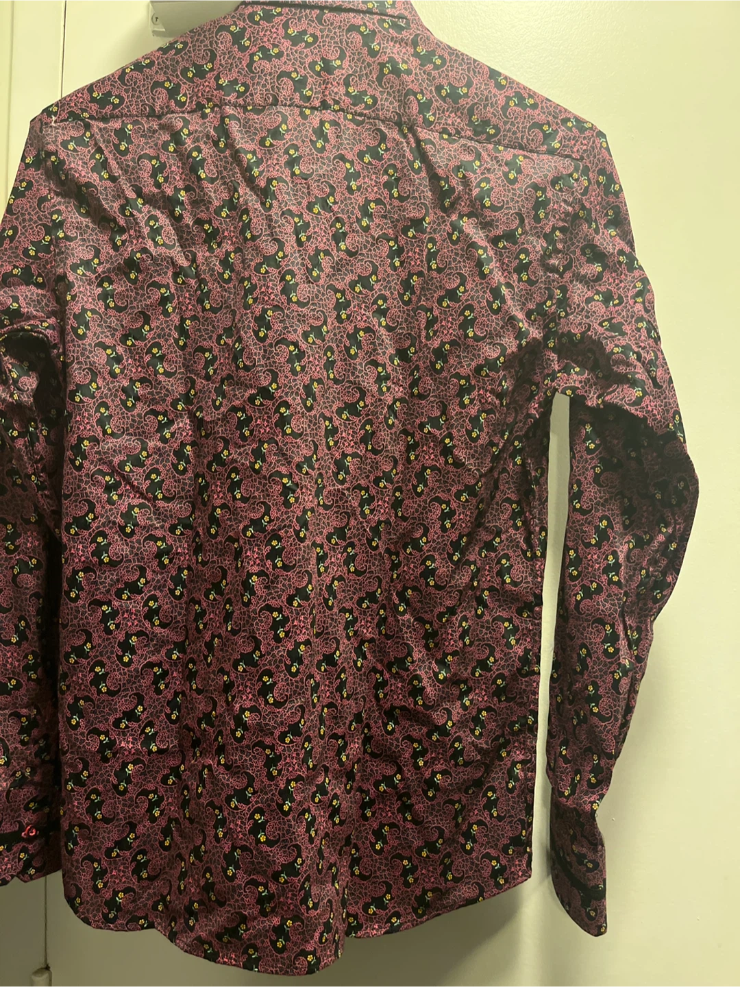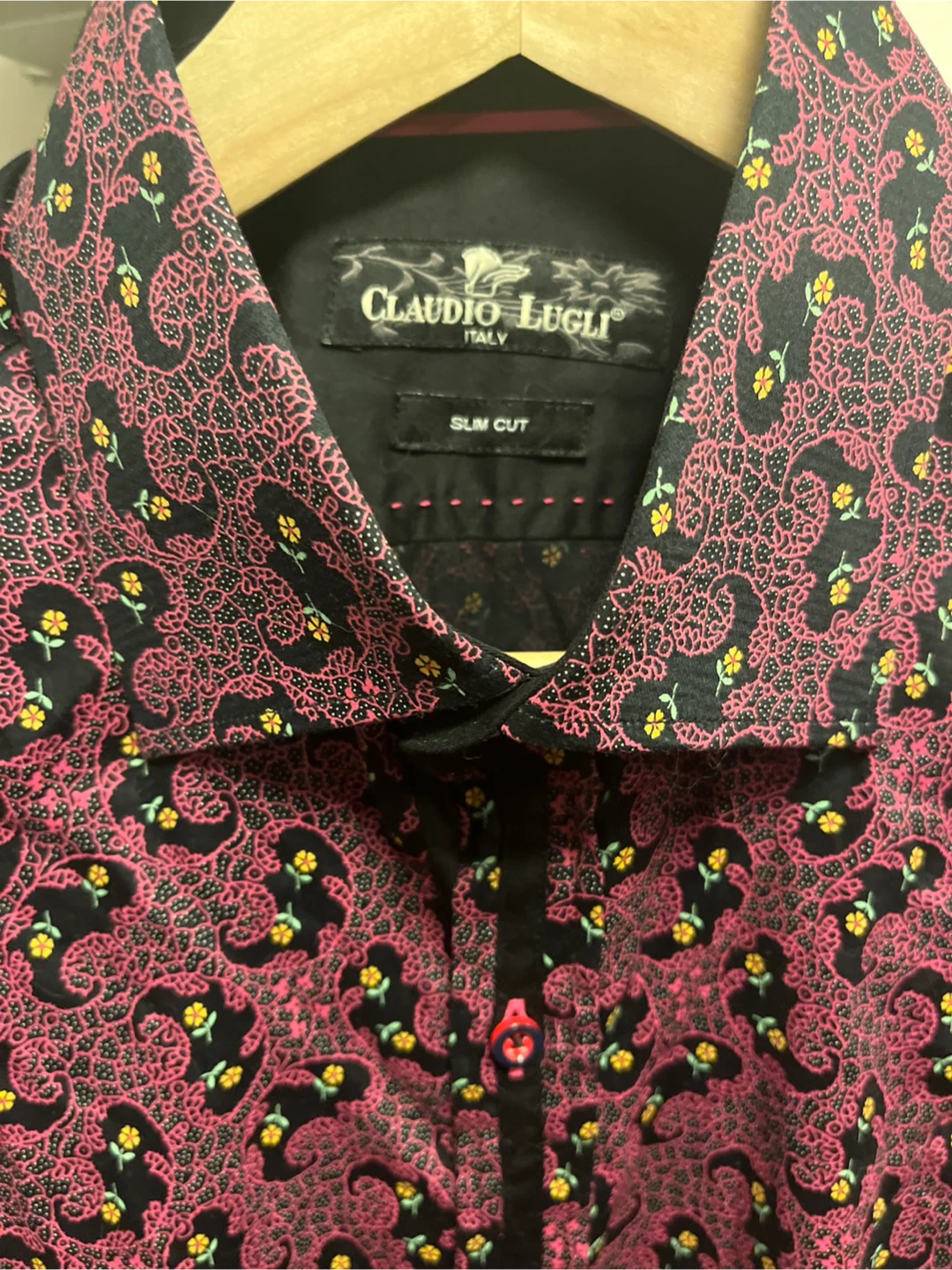 Here's a Claudio Lugli Italy shirt in a slim cut! It features a unique pattern with pink and black colours, with small yellow flower accents. Perfect for adding a stylish touch to your wardrobe!