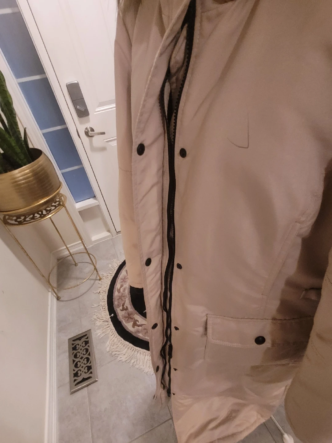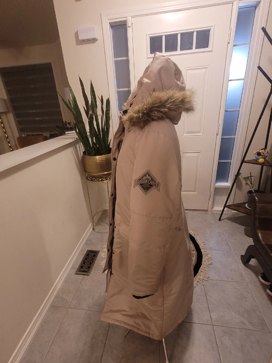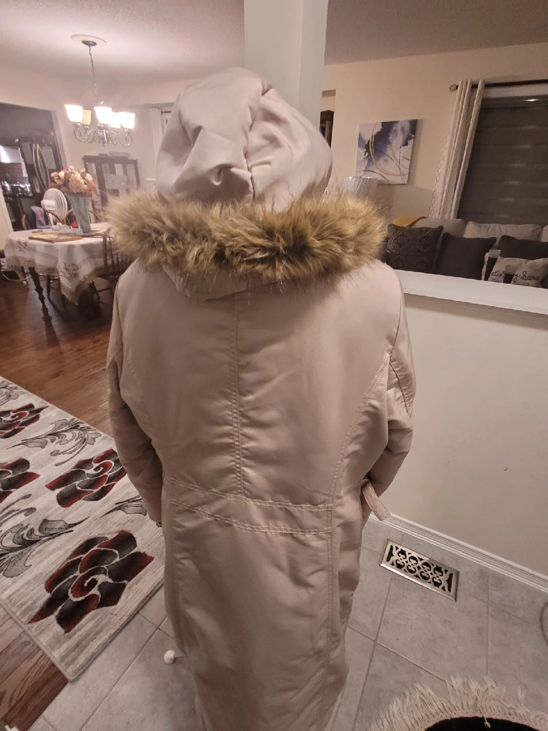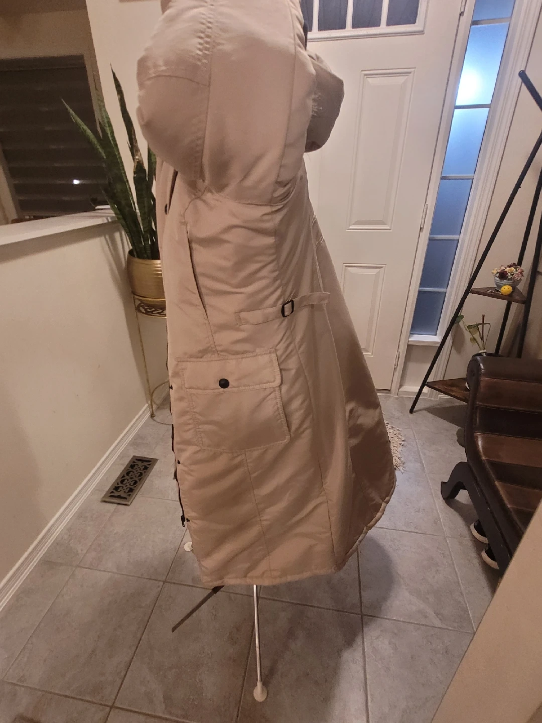 15Cozy up in this long puffer coat from Heater Canes! It's perfect for those chilly Canadian days. The coat is a lovely beige colour and features a fur-trimmed hood for extra warmth and style