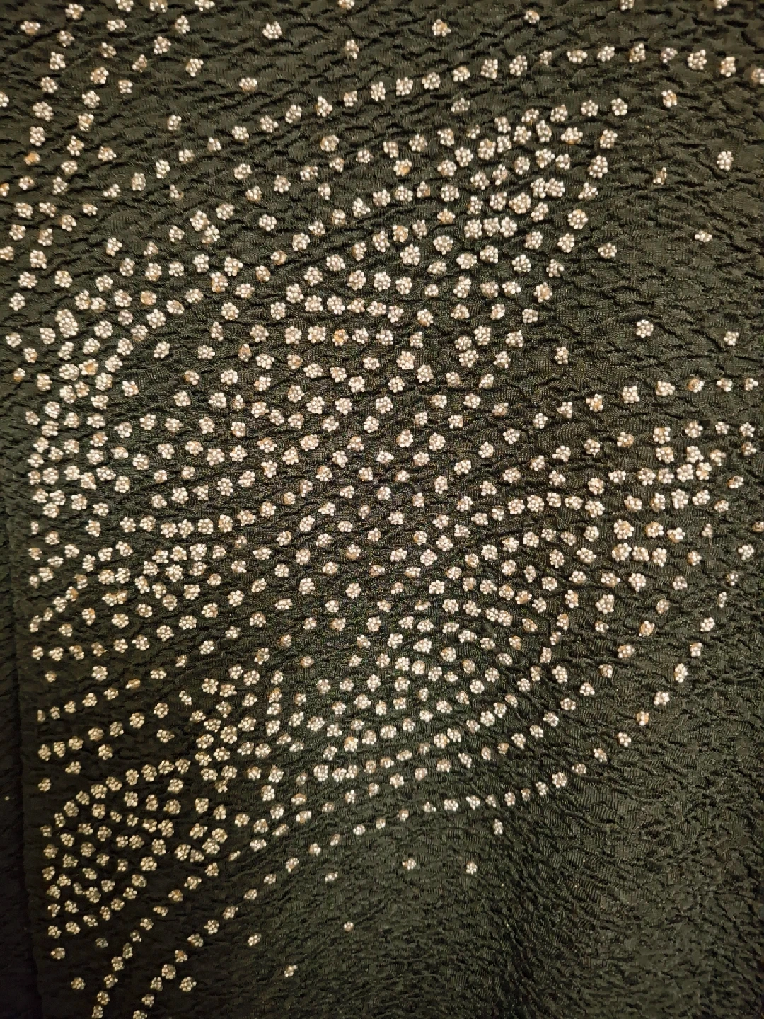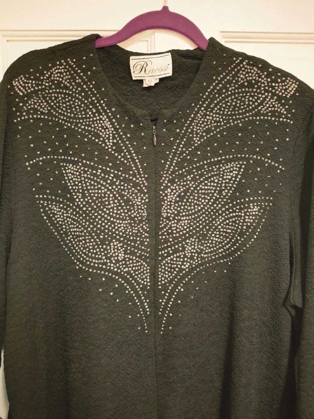 This is a beautiful black zippered, ankle length robe/ dress from Raessii! It features delicate embellishments on the front. Worn with love is good condition.