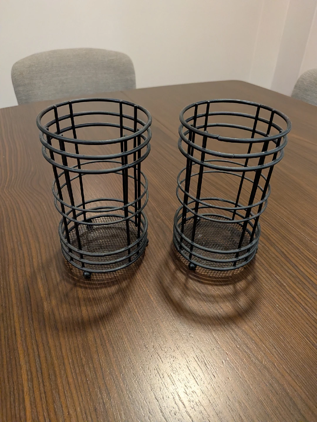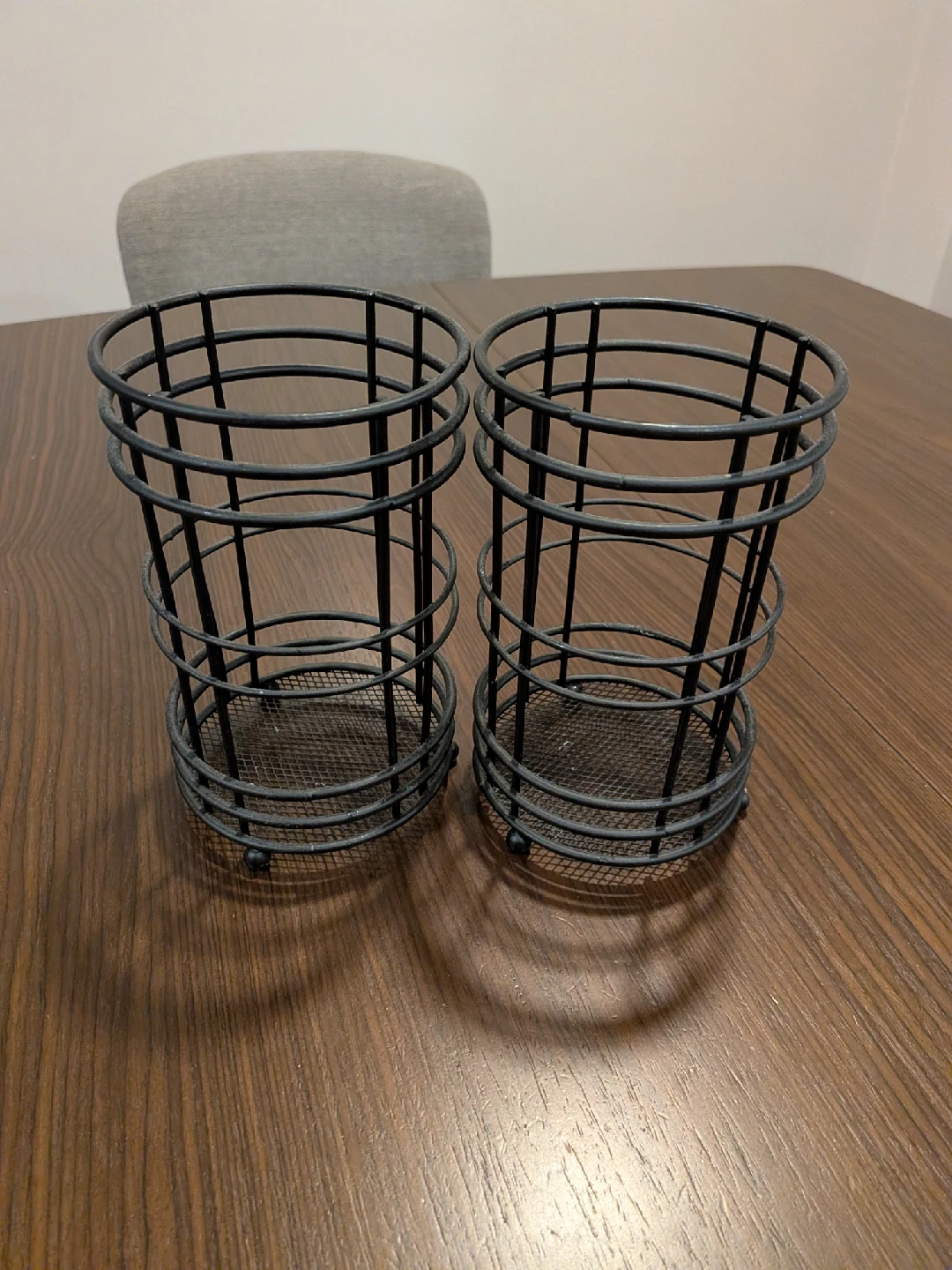 Selling a set of two black metal utensil holders! They're in great condition and perfect for organizing your kitchen tools or even for use as decorative pieces