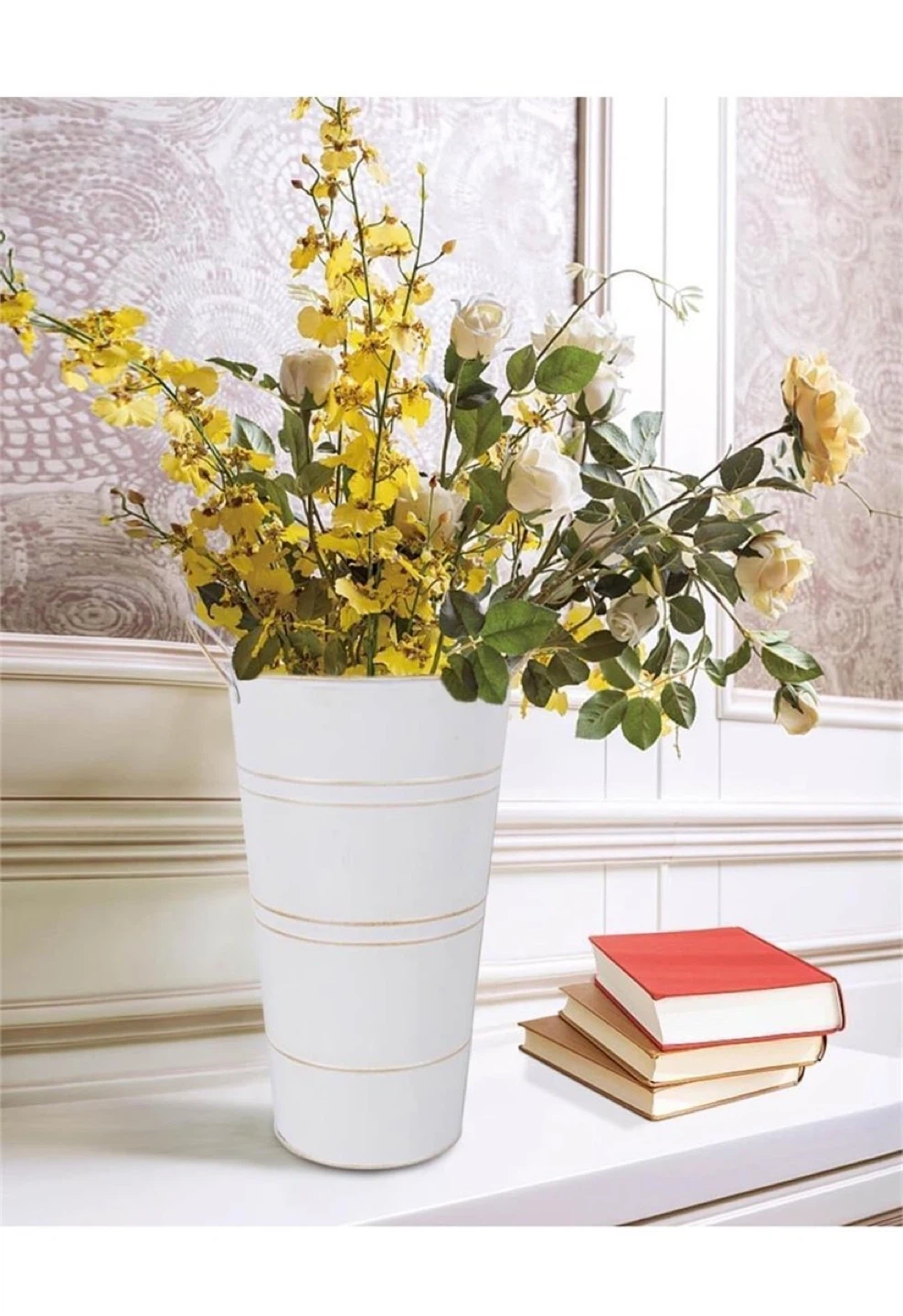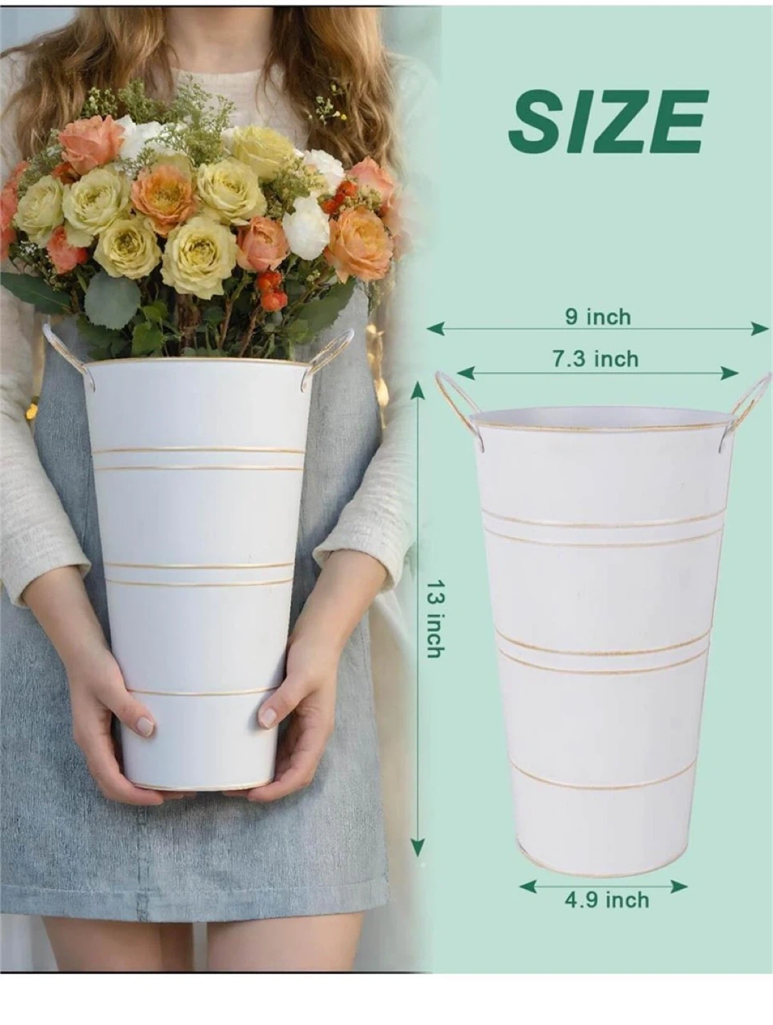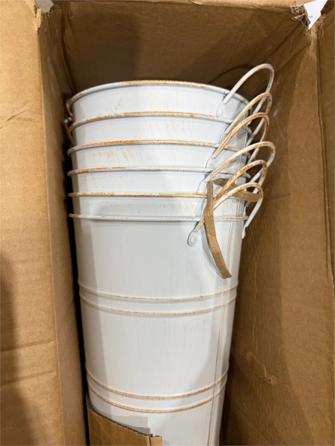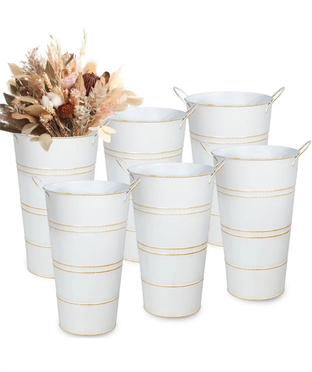 22Selling a set of 6 white metal flower buckets! They are perfect for displaying flowers or plants, and would look great in any home or garden. The dimensions are: - Height: 13 inches - Top Diameter: 9 inches - Bottom Diameter: 4.9 inches