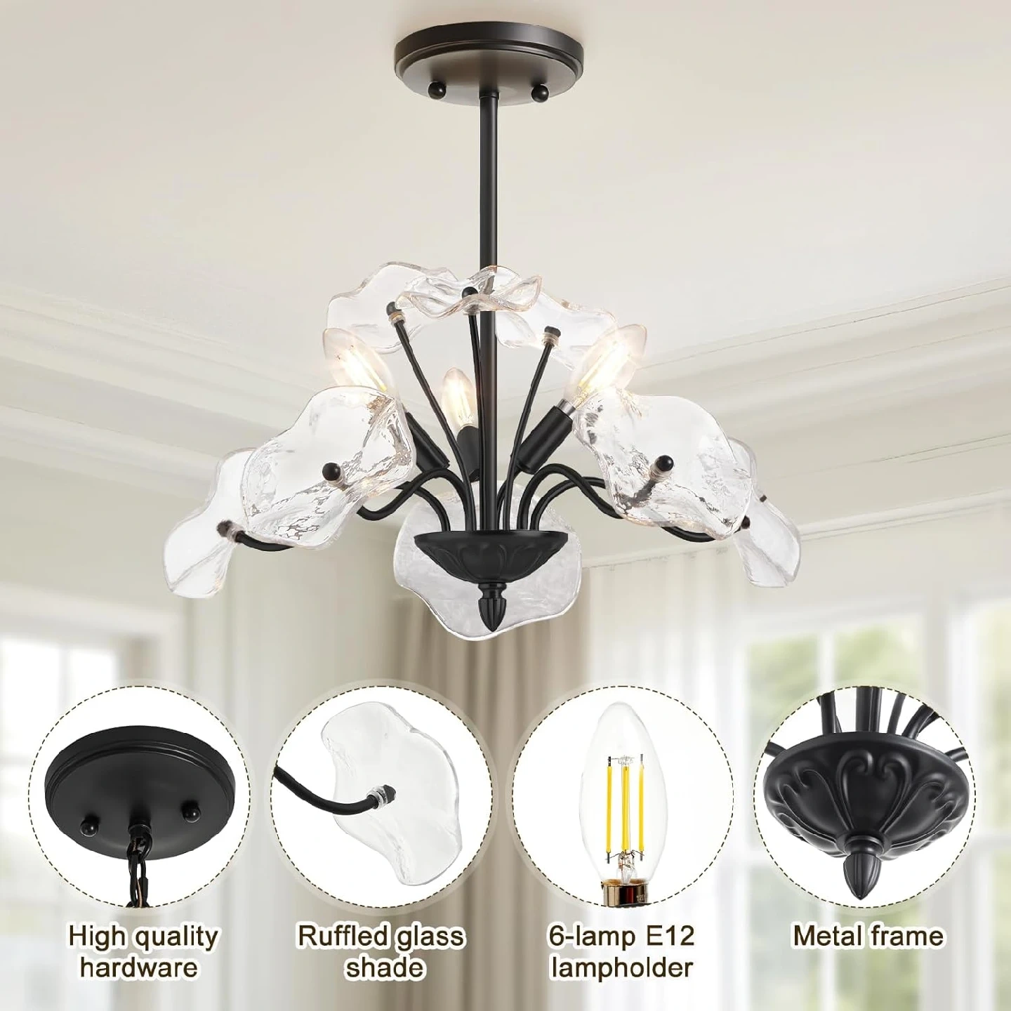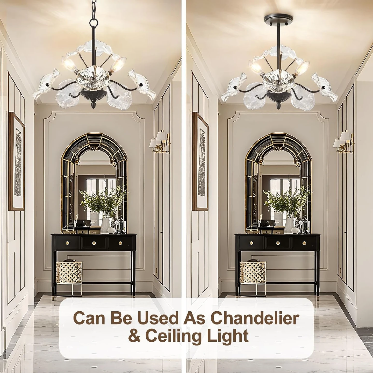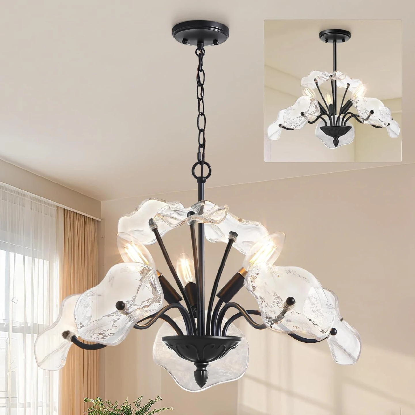 Vintage & Modern Fusion Design:This striking black light fixture combines vintage charm with mid-century modern aesthetics—featuring delicate flower glass shades paired with a sleek black finish, making it both a standout Vintage Chandelier and a trendy modern light fixture. As a unique flower pendant light, it adds a bold yet elegant focal point to any space, effortlessly blending with retro or contemporary decor styles.