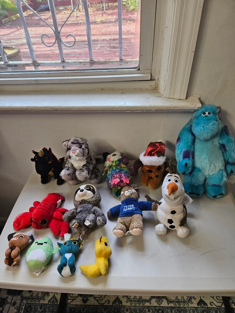 Selling a collection of assorted plush toys! There's a variety of characters and animals, including Sully from Monsters Inc, Olaf from Frozen, and a Peter Rabbit bear. Perfect for kids or collectors