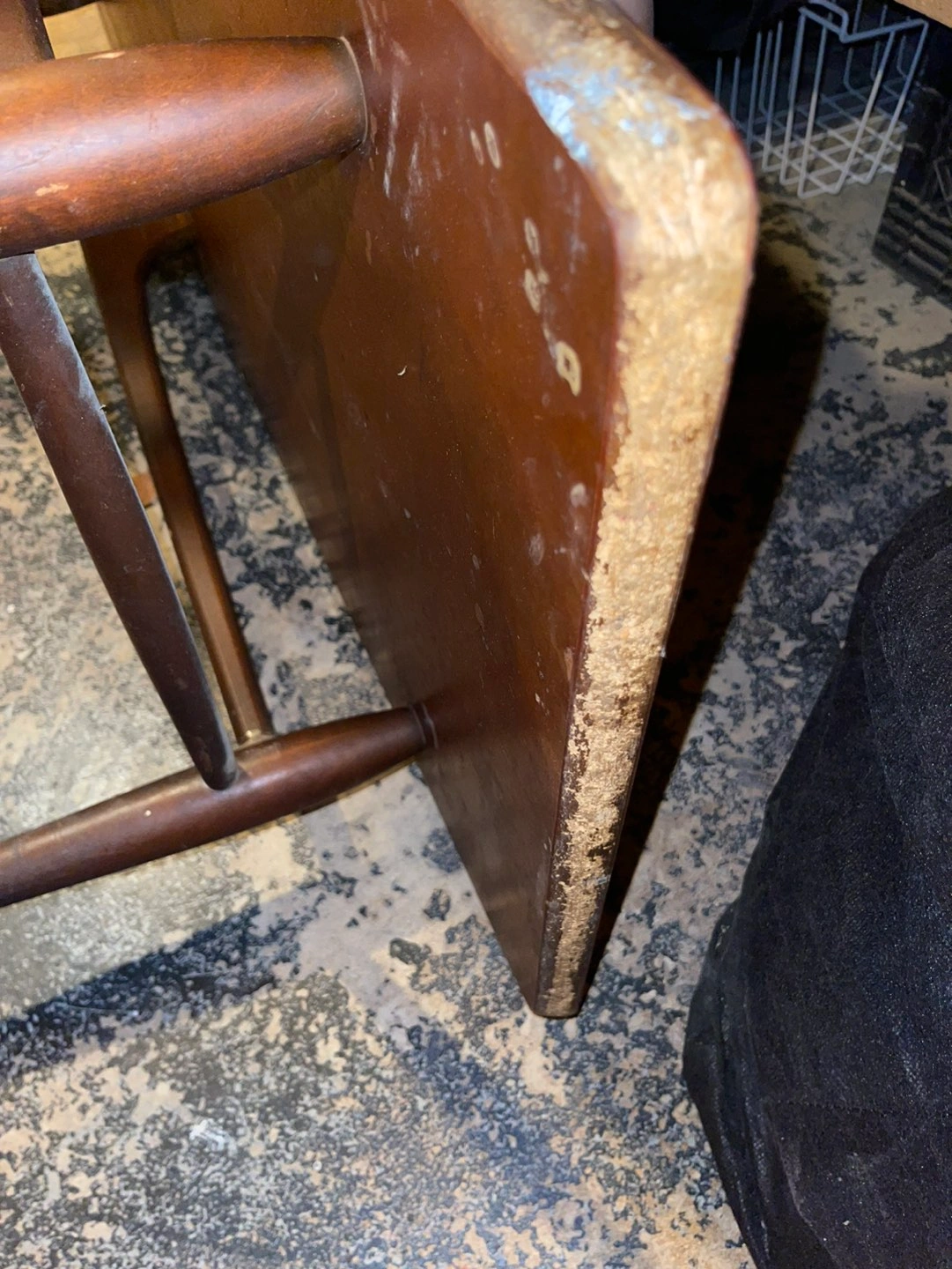 Old, scratches, scrapes, wood loose but with some glue, screw tightened and a fresh paint will do the job.