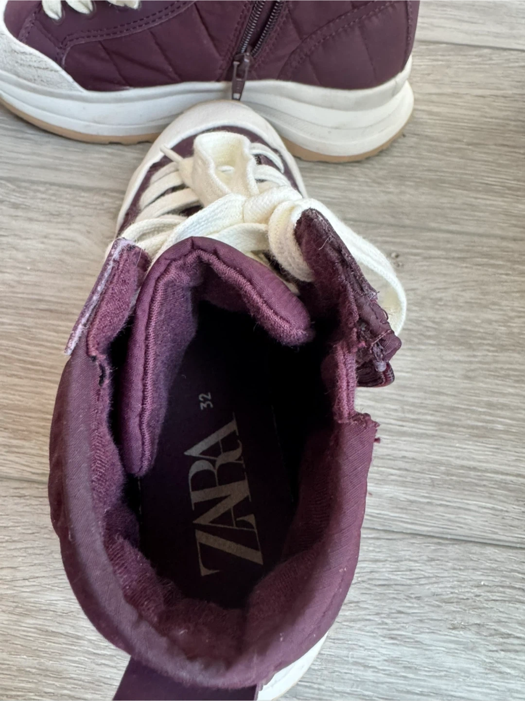Selling a pair of girl’s 👧🏻 Zara high-top sneakers in a lovely burgundy colour😍. They are in good condition and have a unique quilted design on the sides. The shoes feature both laces and a zipper for easy wear. Size is EU32. (EU 32 ≈ US 1 Y or a little higher)😊