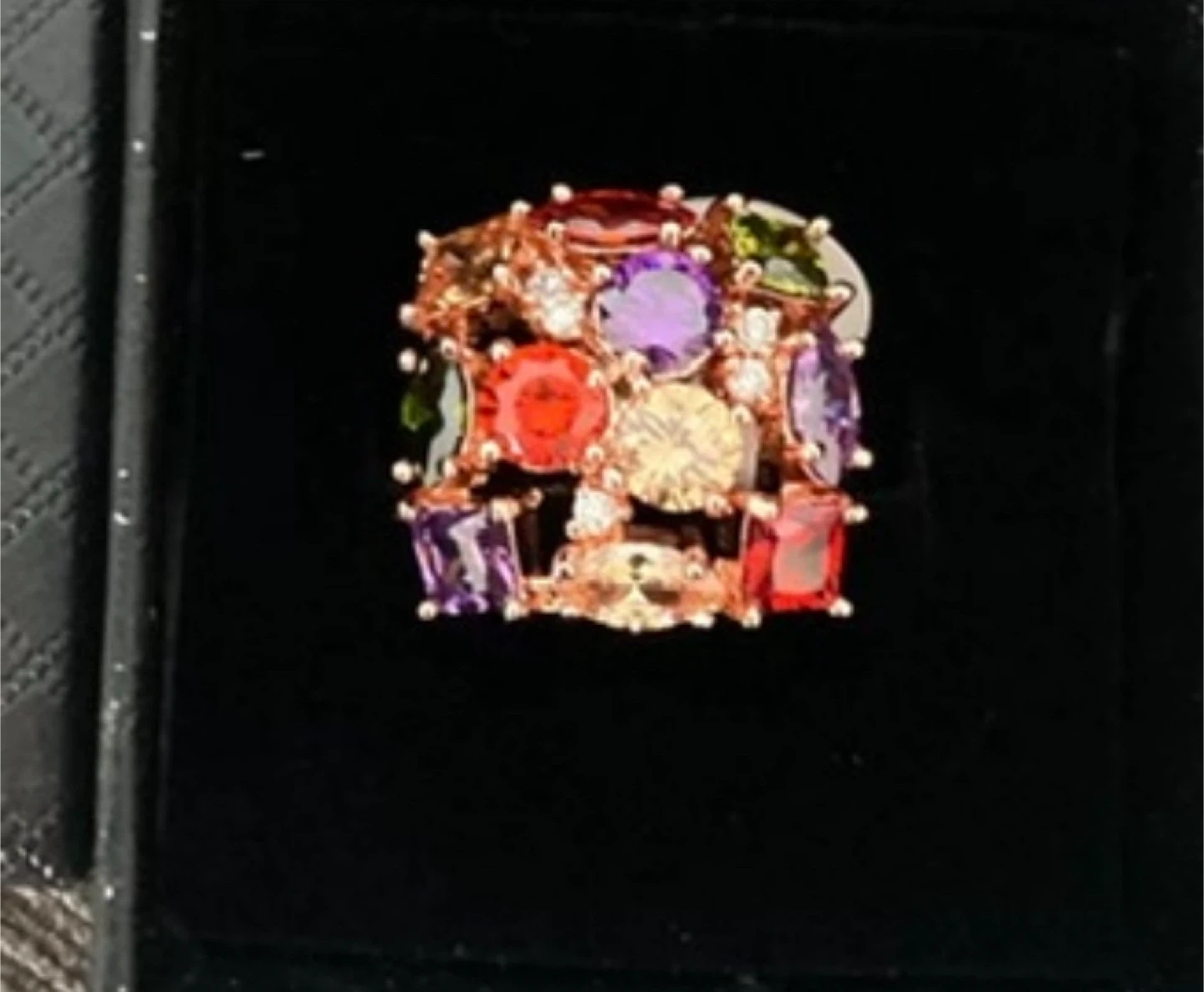 325This is a beautiful ring with colourful gemstones set in a rose gold tone. The ring face is approximately 21.5mm square. It's a real statement piece!