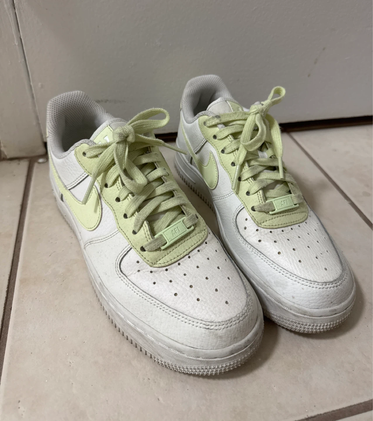 Selling a pair of Nike Air Force 1s in white with green accents. They're used, but still have lots of life left! Please see the photos for condition.