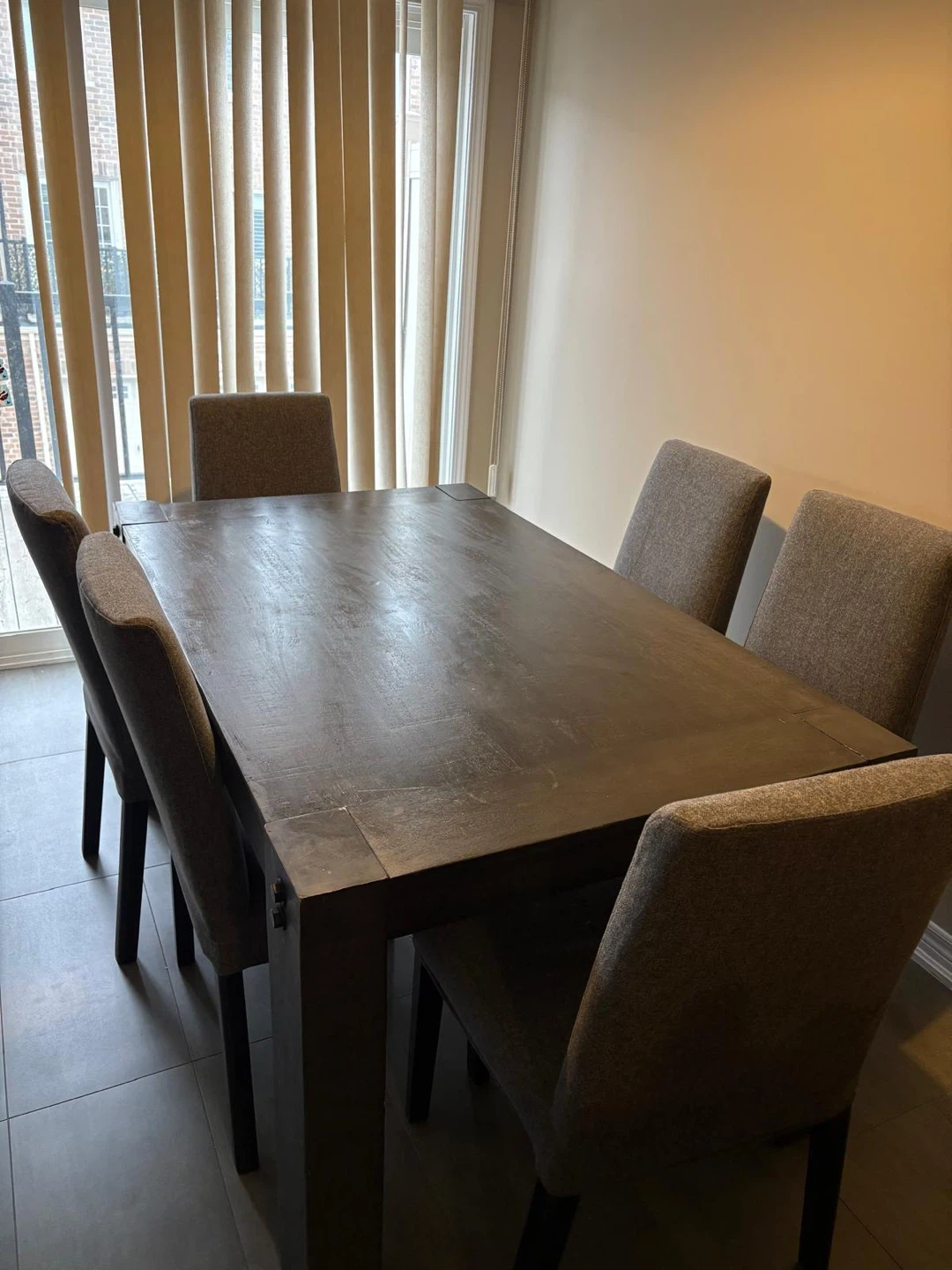 Selling a dining table with six chairs! The table is a dark wood, and the chairs are upholstered in a neutral grey fabric. It's a great set for family dinners or entertaining guests. In good condition and ready for a new home