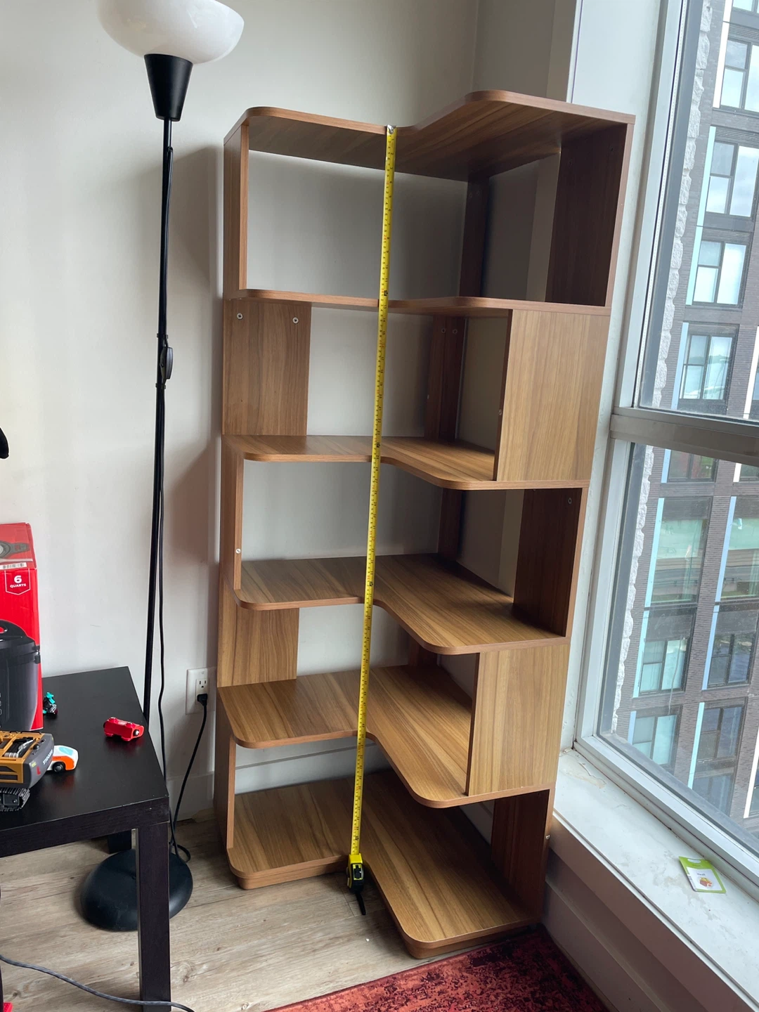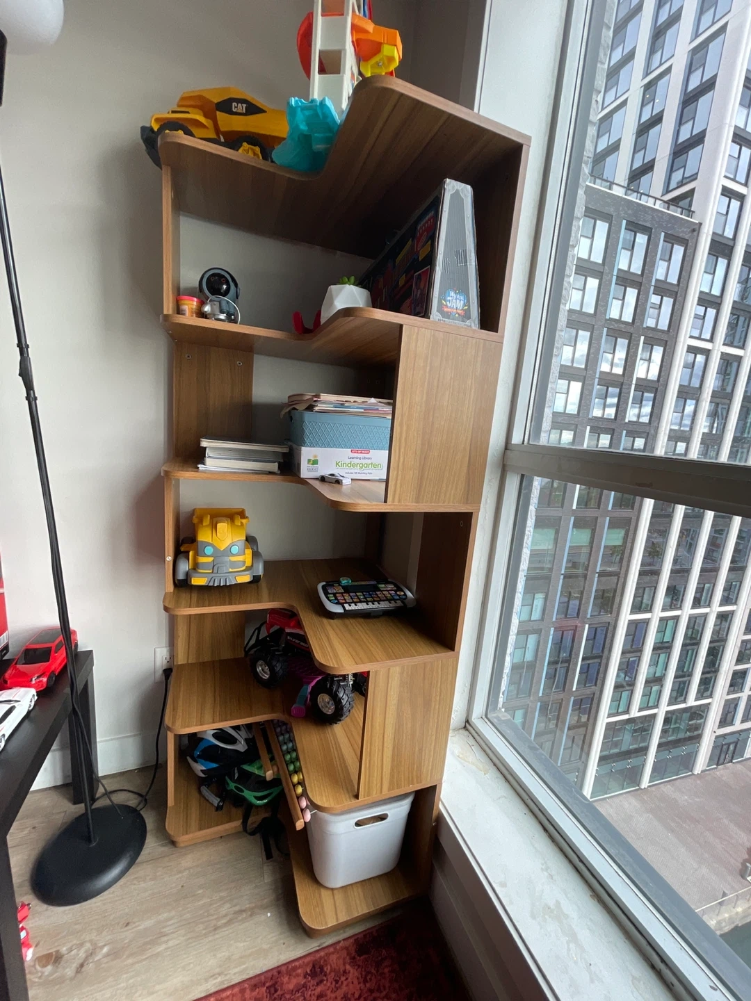 Selling a unique beautiful looking corner shelf! It's made of wood and stands approximately 64 inches tall and 25” width each side. Each shelf height is 12”. It's perfect for displaying toys, books, or decorations.