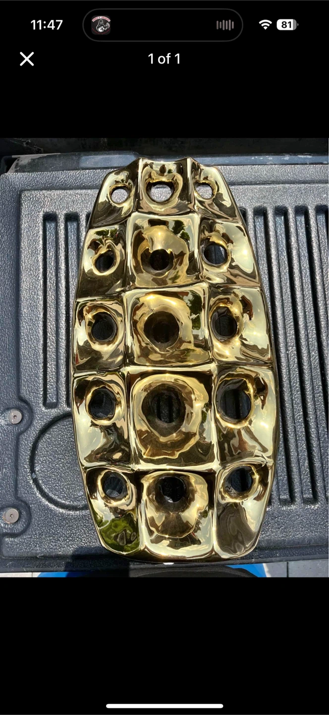 Unique gold decorative wall art. It has a grid-like design with hollow squares. It is in good condition and ready to be hung up on a wall!