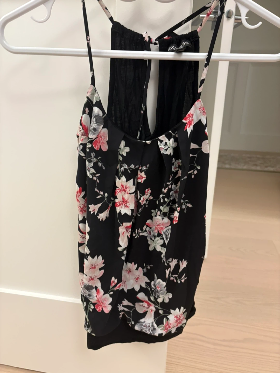 Here's a lovely Express tank top with a beautiful floral pattern! It's a size small and features a stylish black back. Perfect for adding a touch of elegance to your wardrobe!