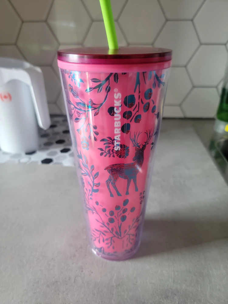 Selling a Starbucks tumbler in excellent condition! It holds 24oz / 710 mL and features a beautiful floral and deer design on a pink background. Perfect for keeping your drinks cold on the go