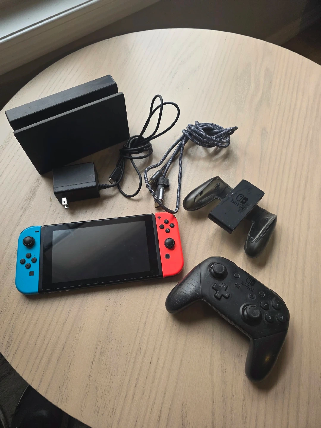 Selling a used Nintendo Switch console in good condition. It comes with the dock, charger, and a Pro Controller for a better gaming experience. Ready for a new home!
