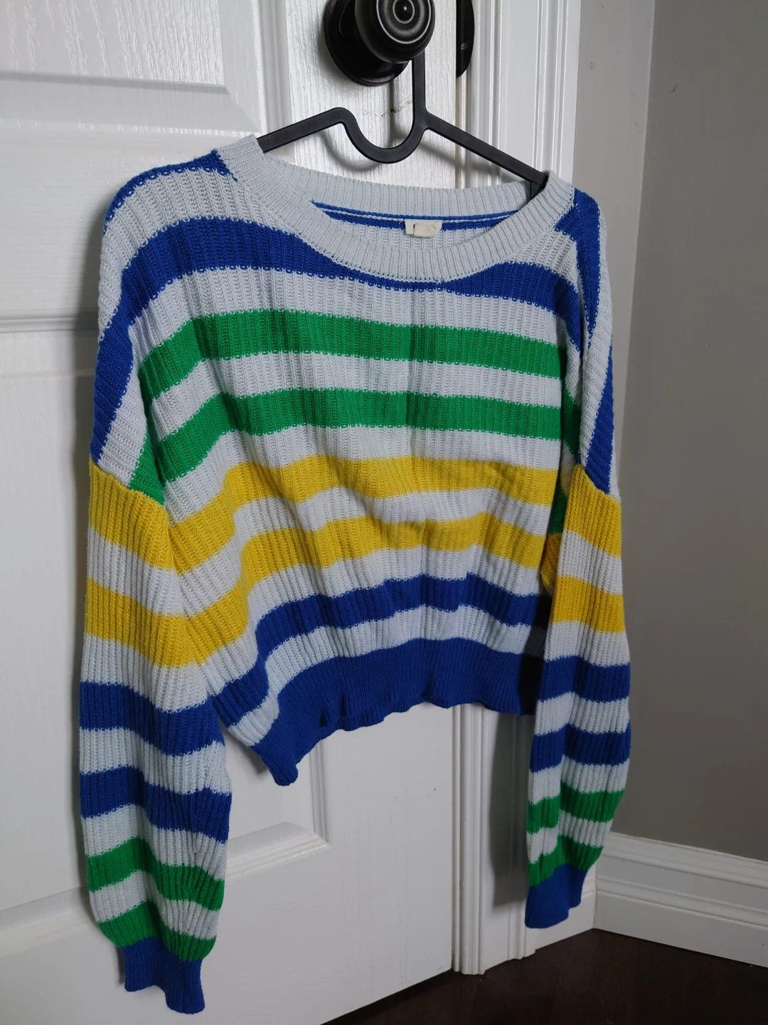 Cozy and colourful Garage sweater! It's a size P/S and features a fun striped pattern in blue, green, and yellow. Perfect for adding a pop of colour to your wardrobe