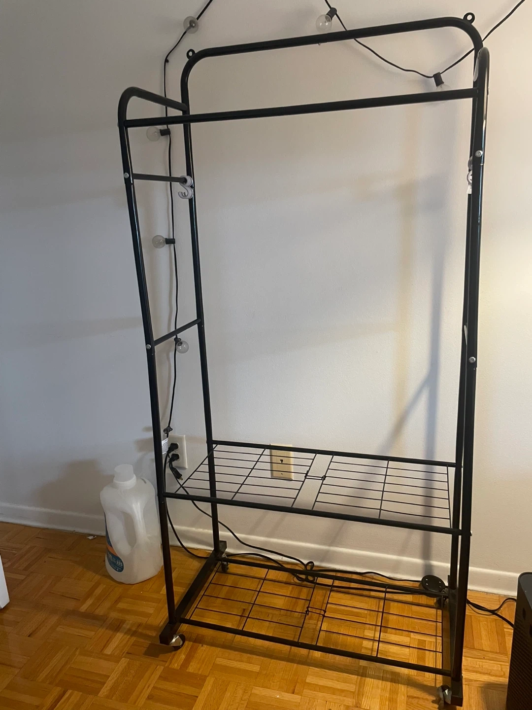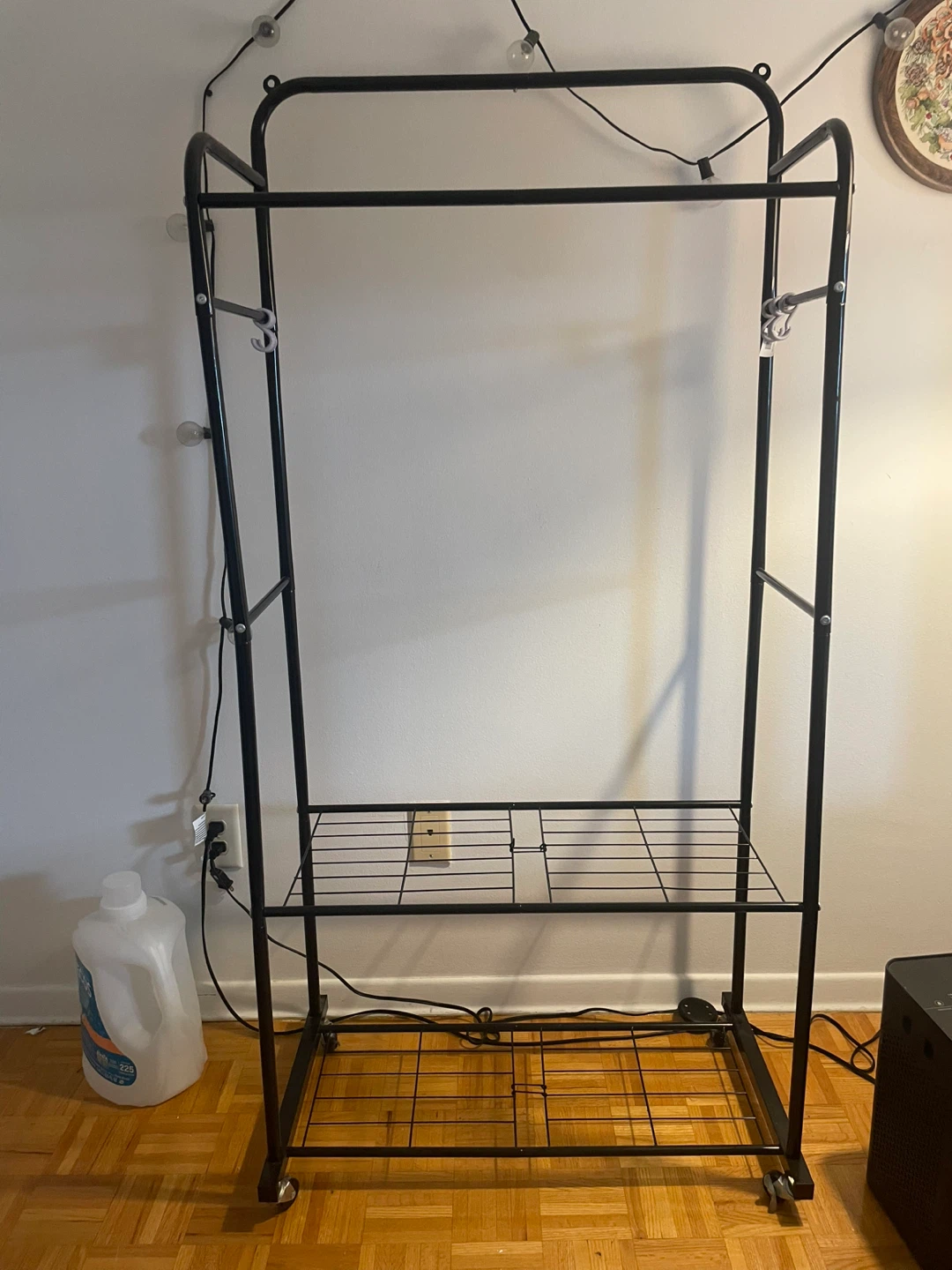 Selling a black metal rolling clothes rack! It's super handy for extra storage or organizing your clothes. It has a top bar for hanging clothes, a middle shelf, and a bottom shelf for shoes or other items. It also has wheels, so it's easy to move around, and hooks on the sides for smaller items. Perfect for small spaces or anyone who needs a bit more closet space
