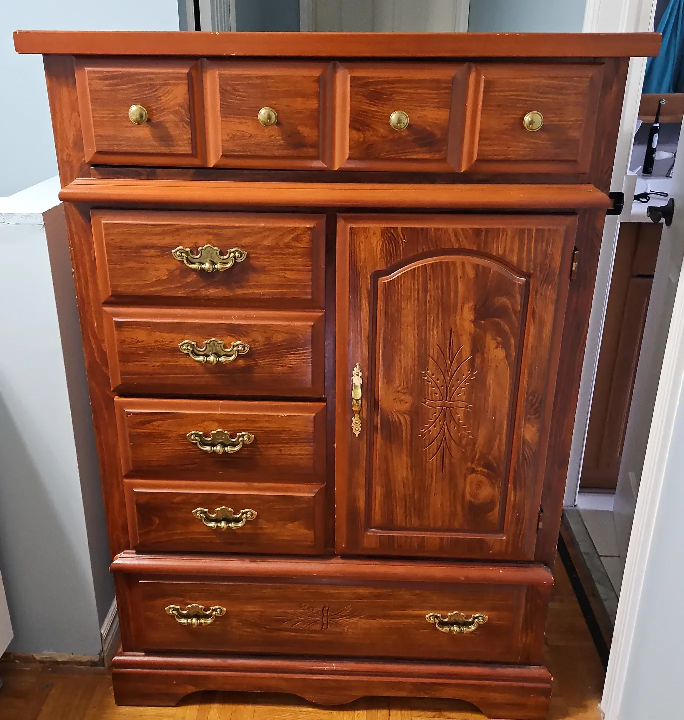 Here's a lovely wooden dresser with a cabinet! It features multiple drawers and a cabinet for ample storage. The dresser has a warm, reddish-brown tone and ornate brass-coloured handles.