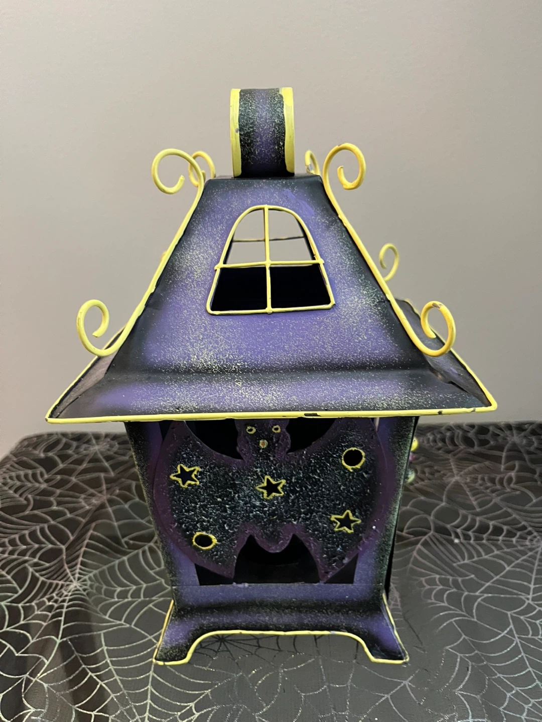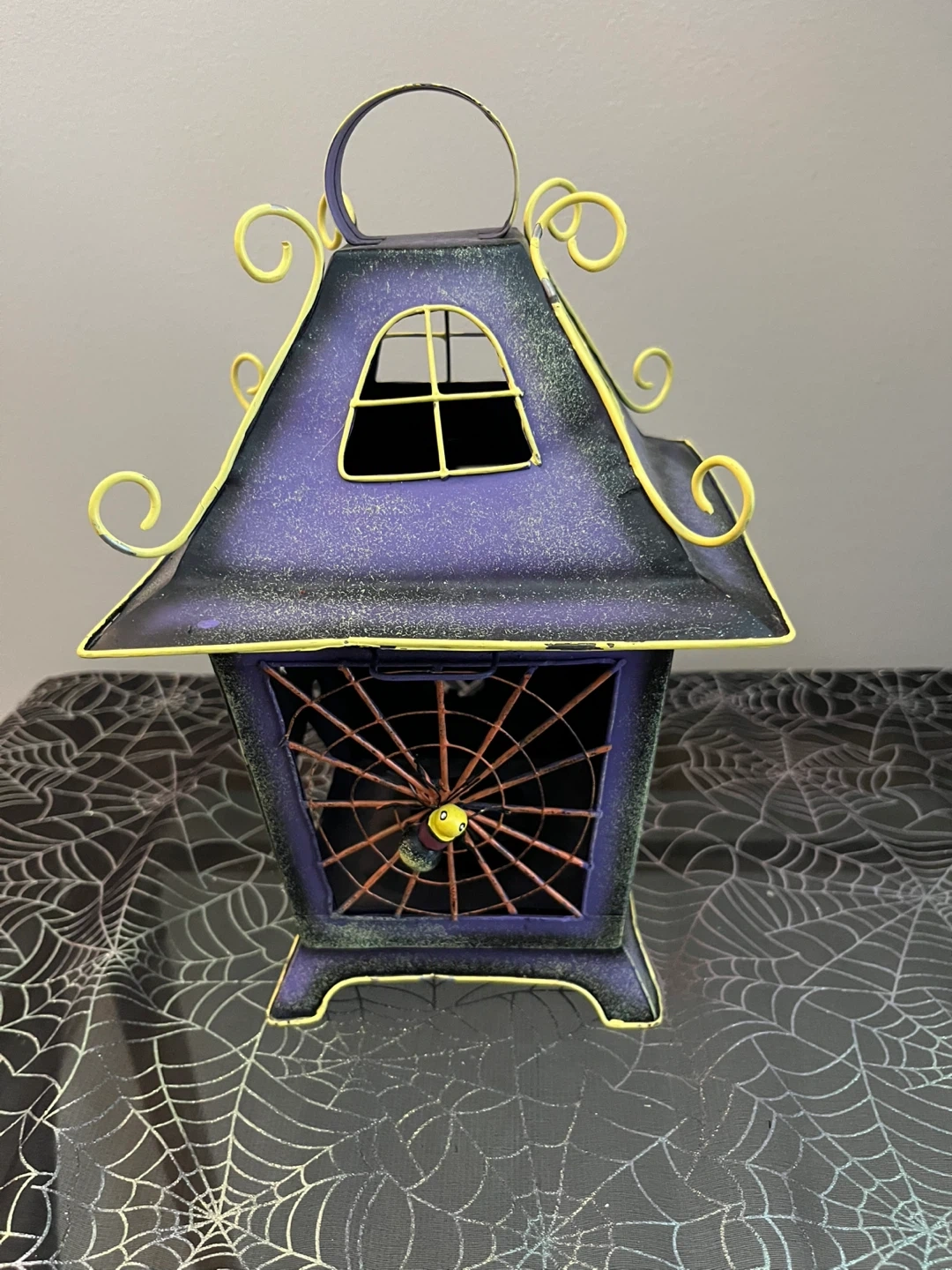 This is a cute Halloween-themed lantern. It features various Halloween designs on each side, including a witch, spider, pumpkin, and bat. It's perfect for adding a spooky touch to your Halloween decor! Holds a tealight inside/ moving sale /smoke free home