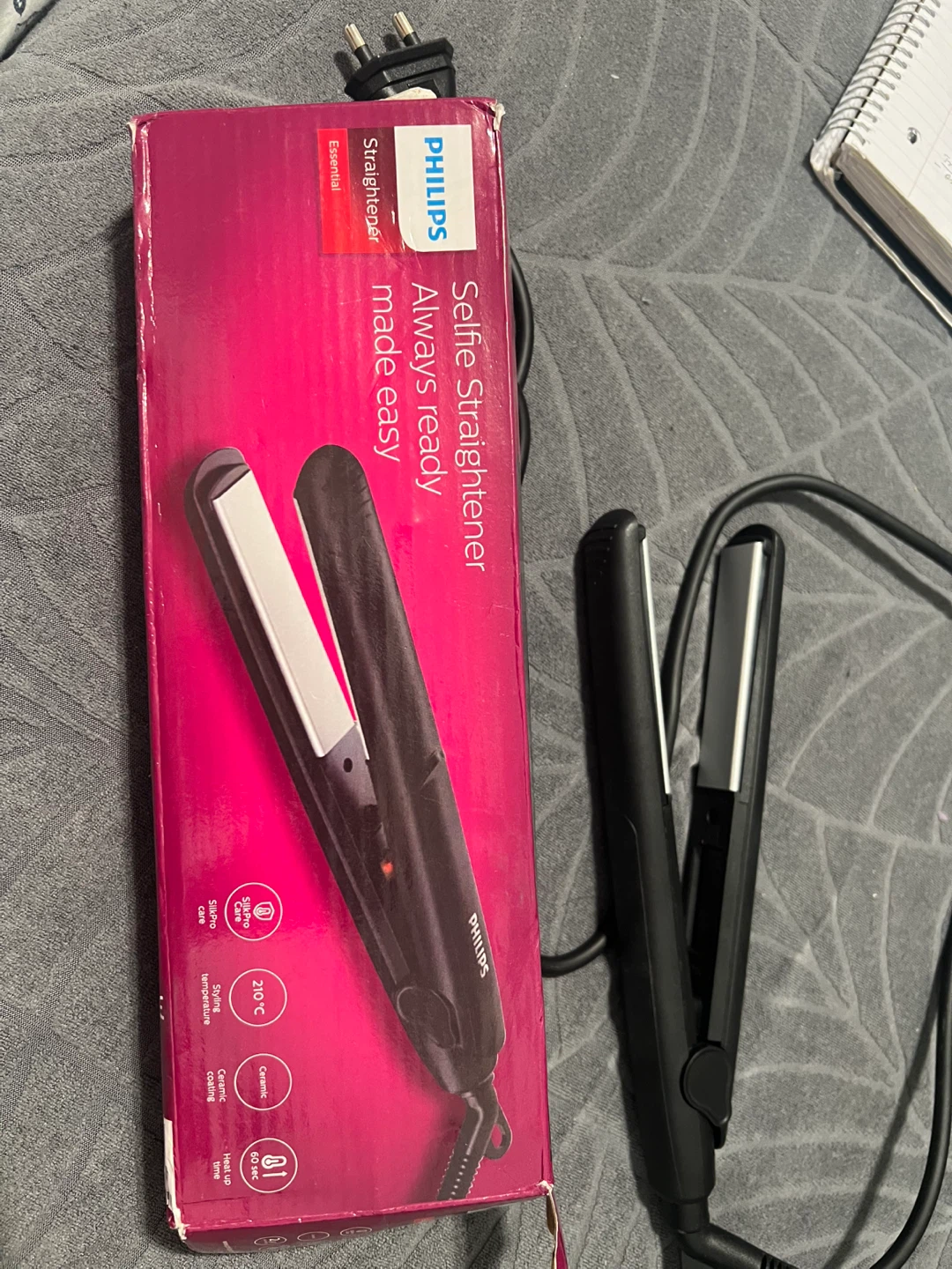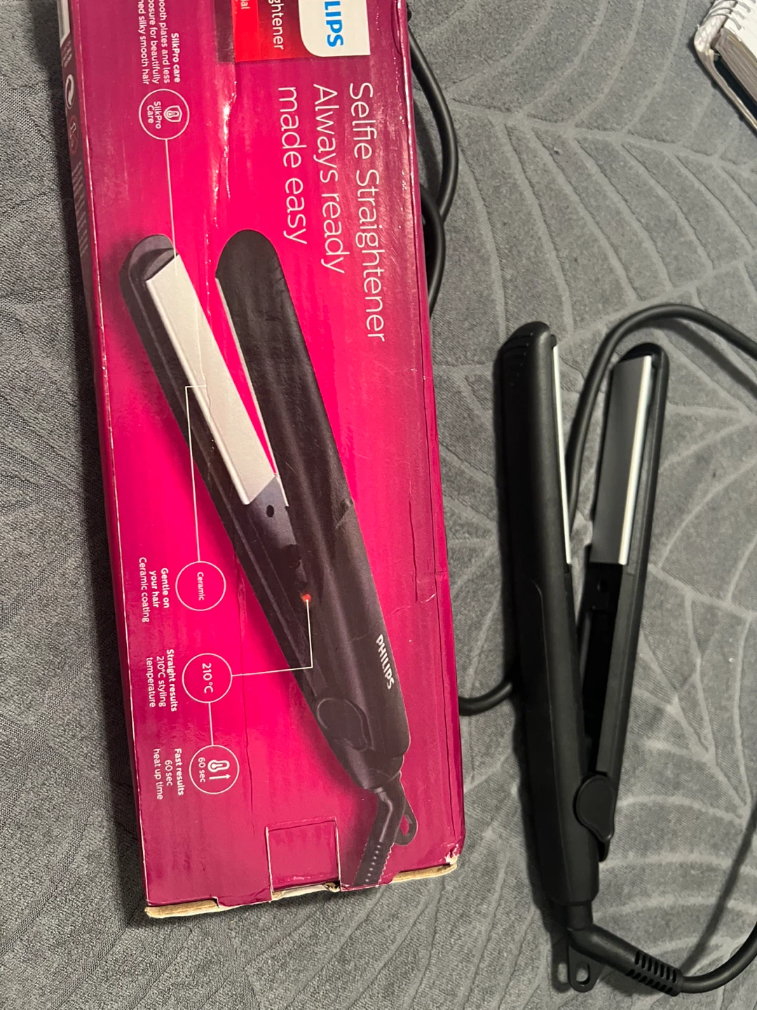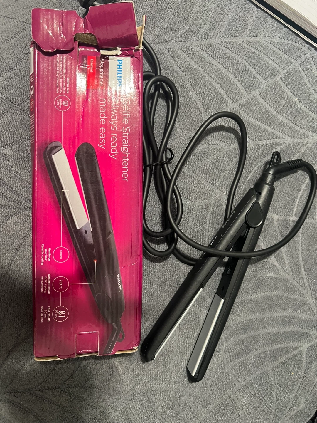 Selling a Philips Straightener! It's a brand new and comes with its original box. The straightener has ceramic coating and a swivel cord for easy use. It heats up quickly and reaches 210 °C for styling