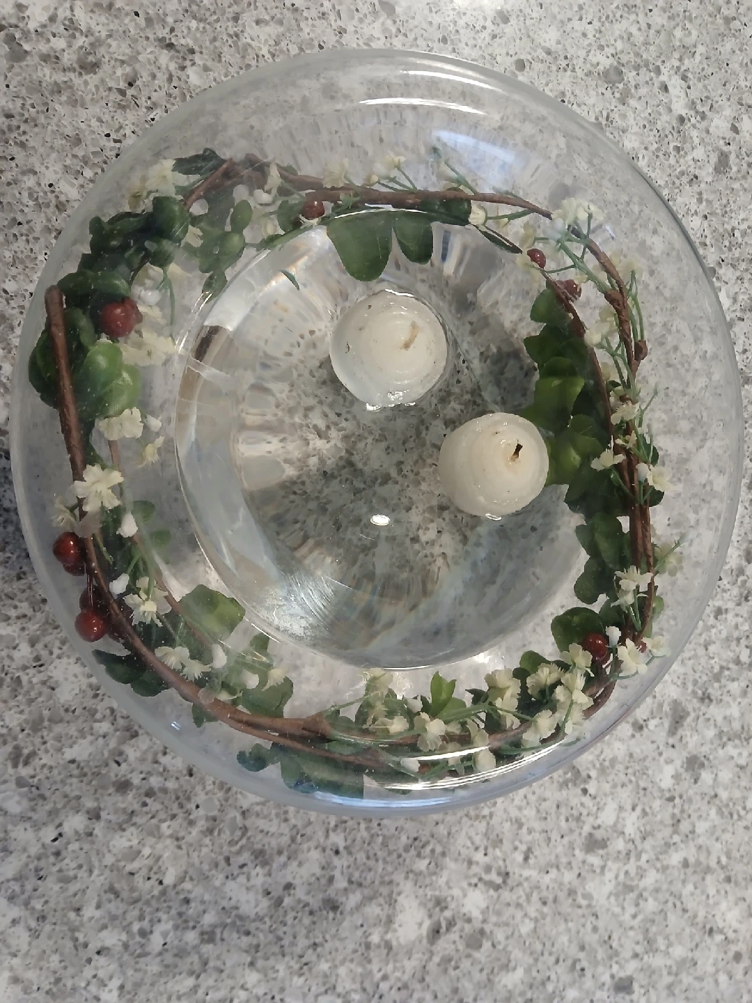 1000+*Cash and pick up ONLY at location shown on ad. *No trades or delivery. Large clear glass bowl. Perfect for a centrepiece, floating candles or decor. Great for adding a touch of greenery to your home. It comes with a decorative garland already inside, as shown in the pictures.