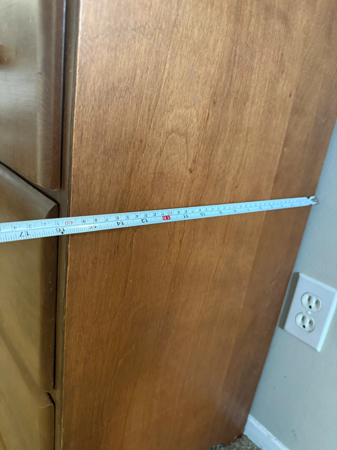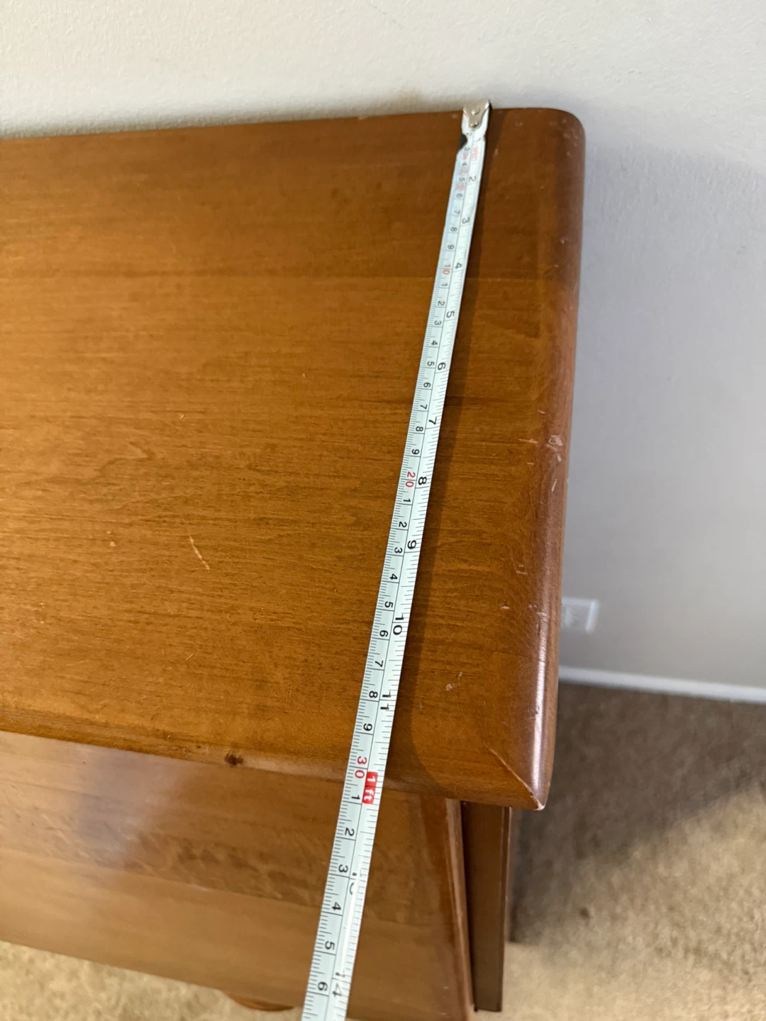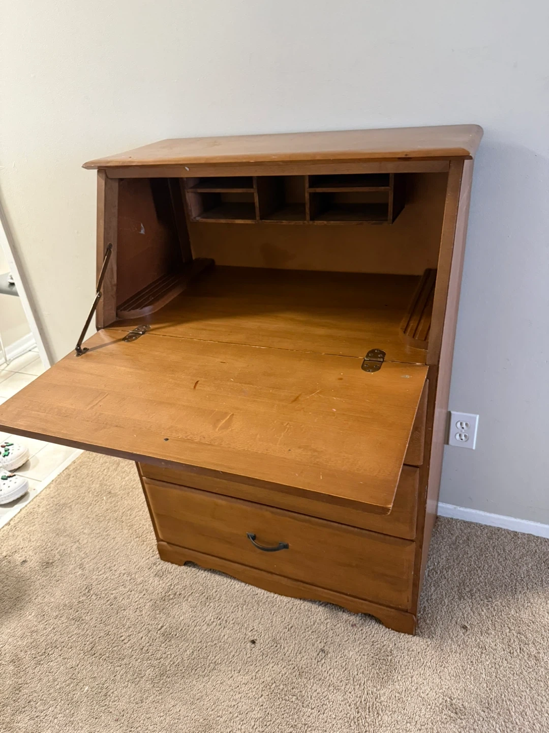 used wooden secretary desk with multiple drawers. The desk has a drop-down writing surface and several compartments for storage. Perfect for a home office or study space!