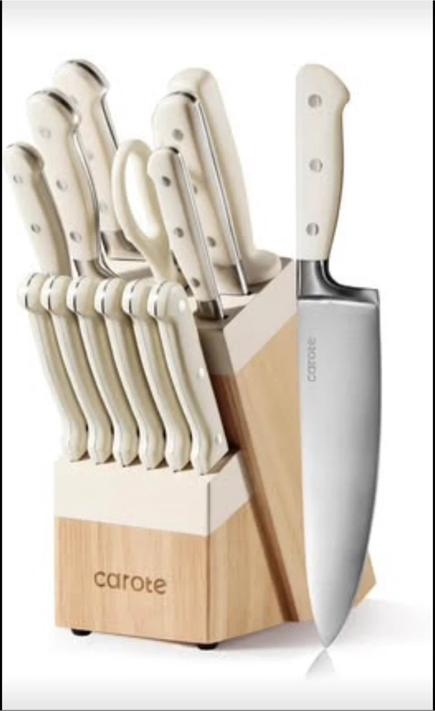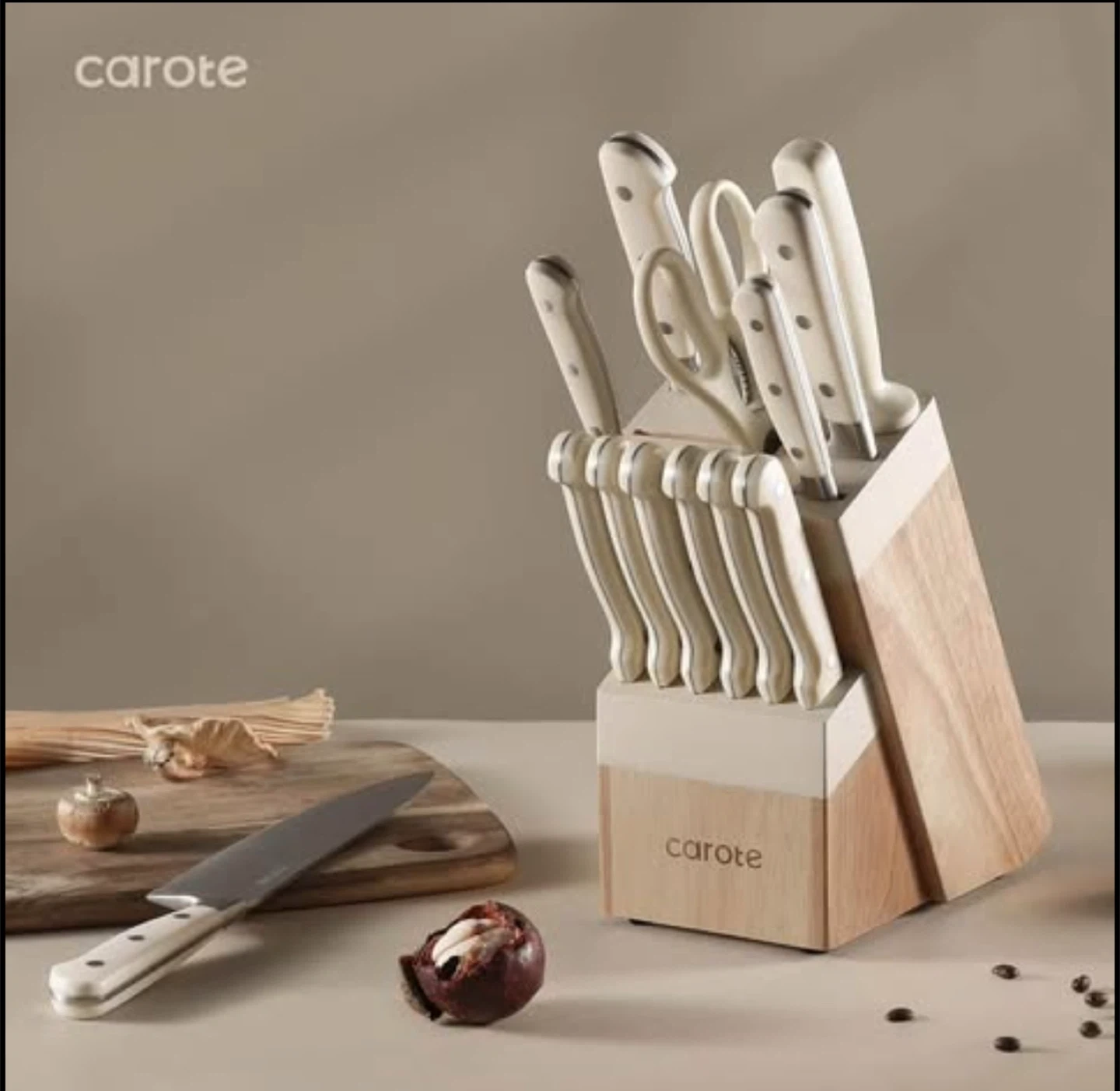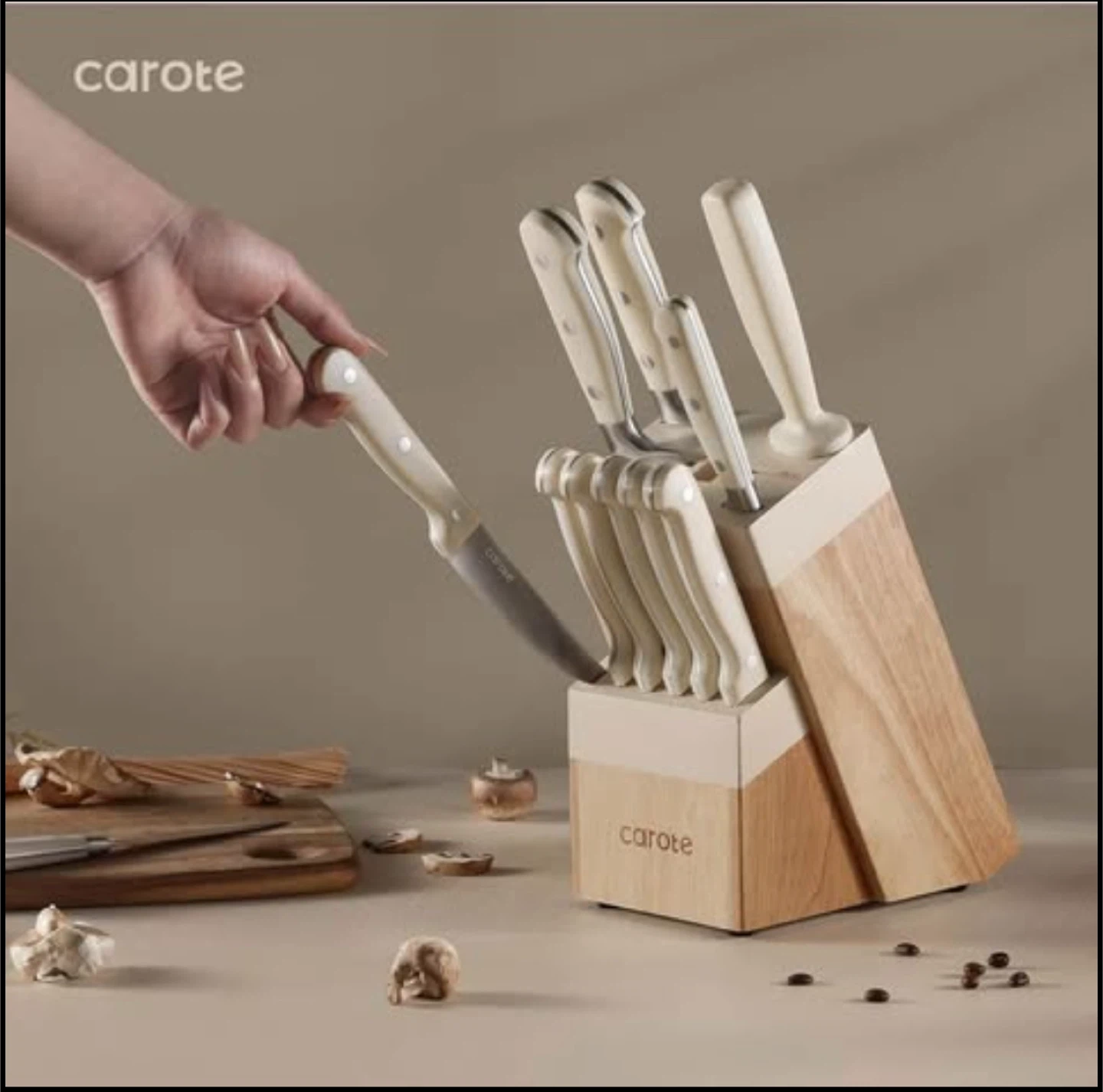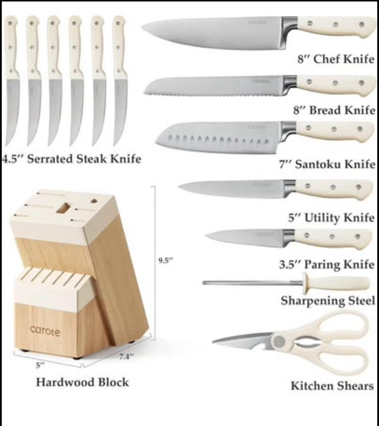 Looking to upgrade your kitchen knives? This Carote 14-piece knife set is perfect! It comes with a hardwood block for safe and stylish storage. The knives feature full tang construction for exceptional control and razor-sharp stainless steel blades. Included are an 8" chef knife, 8" bread knife, 4.5" serrated steak knives, 7" santoku knife, 5" utility knife, 3.5" paring knife, sharpening steel, and kitchen shears
