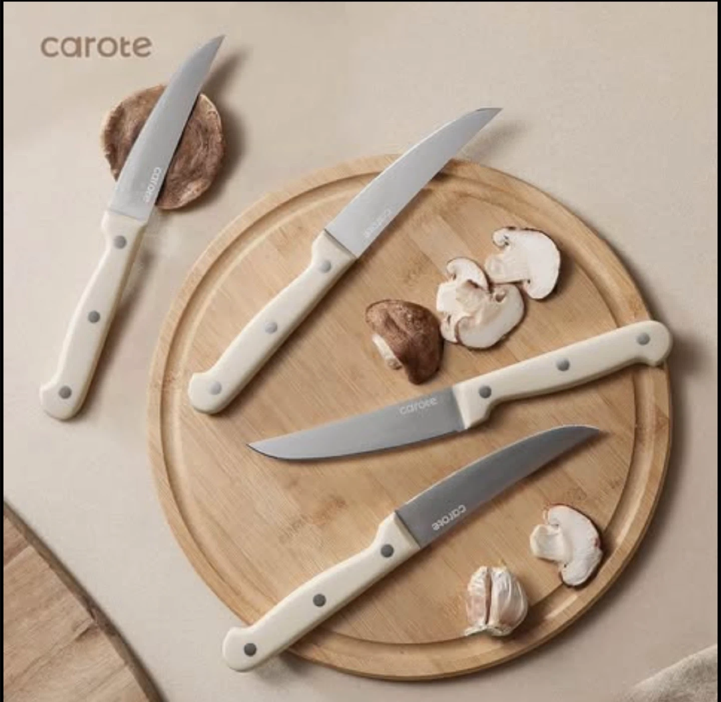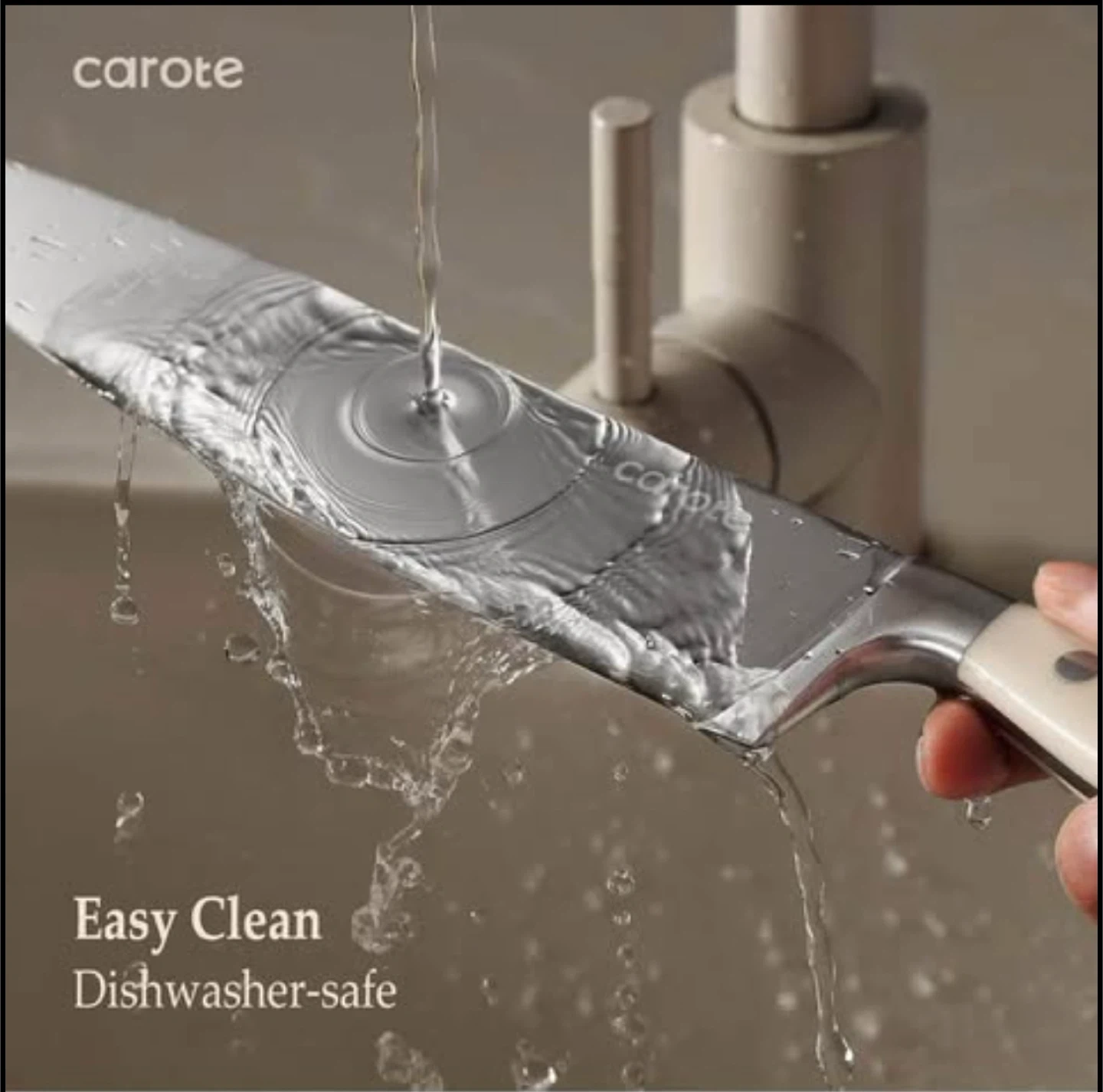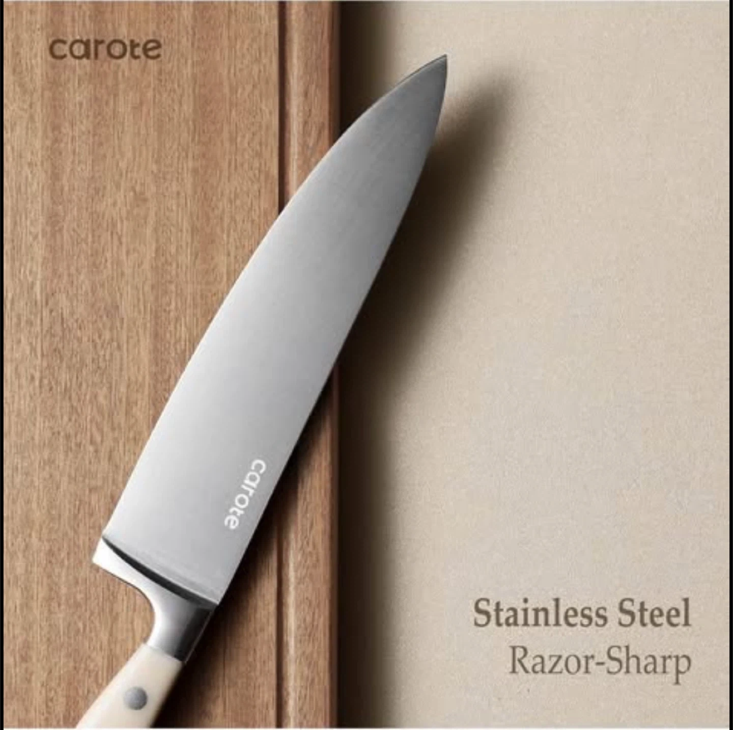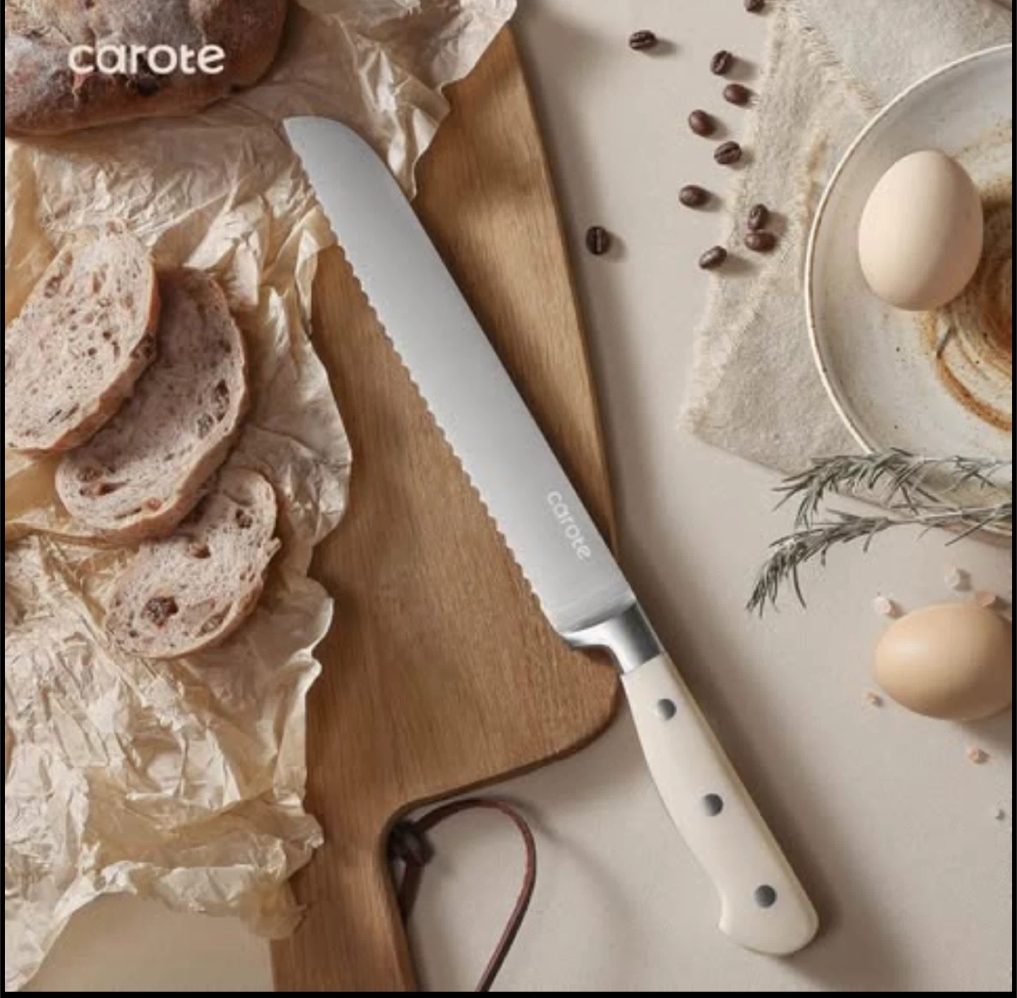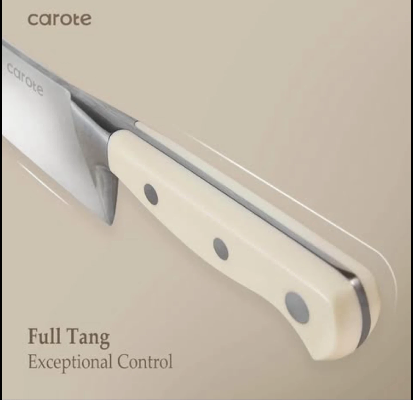 Looking to upgrade your kitchen knives? This Carote 14-piece knife set is perfect! It comes with a hardwood block for safe and stylish storage. The knives feature full tang construction for exceptional control and razor-sharp stainless steel blades. Included are an 8" chef knife, 8" bread knife, 4.5" serrated steak knives, 7" santoku knife, 5" utility knife, 3.5" paring knife, sharpening steel, and kitchen shears