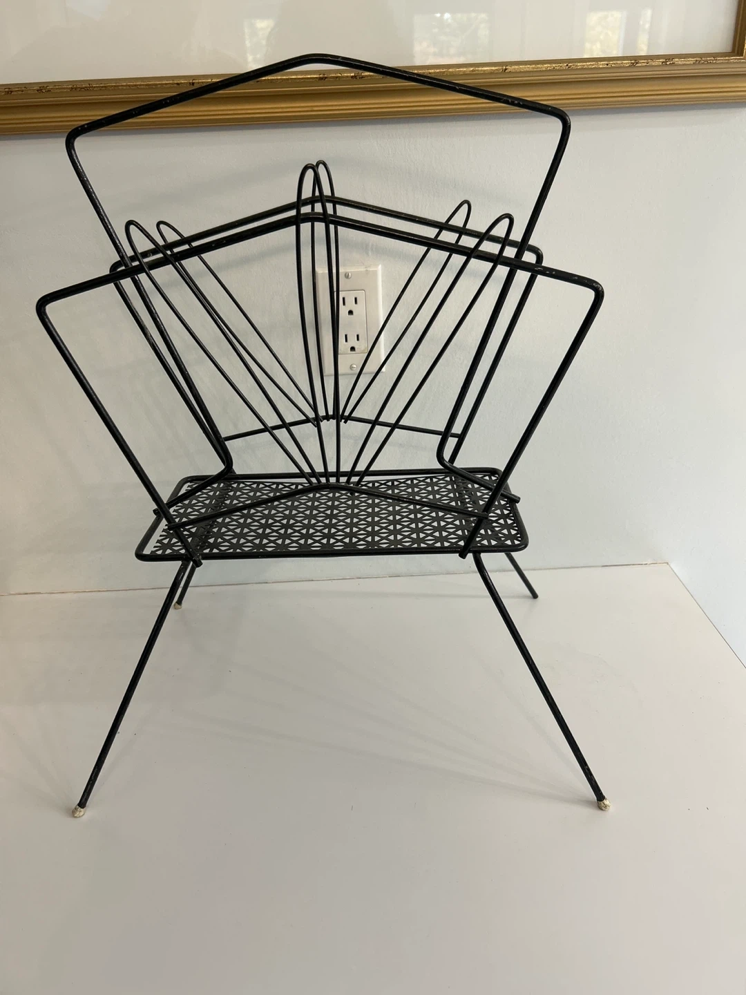 22Selling a vintage metal magazine rack! It's in great shape and perfect for adding a touch of retro style to your living room or office. It has a black finish and a cool geometric design.