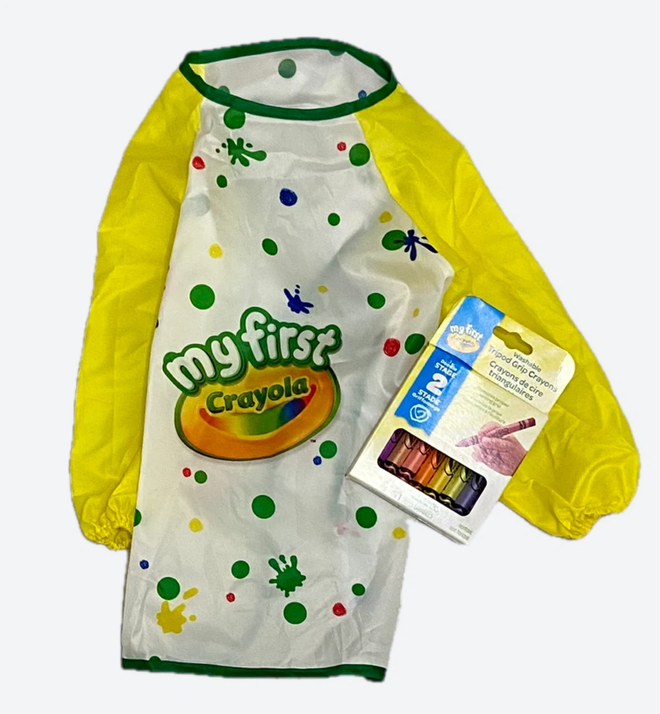 This set includes a Crayola My First Art Smock with yellow sleeves and a pack of My First Crayola Tripod Grip Crayons. The crayons are washable and designed to promote proper writing grip. This set is perfect for your little artist!