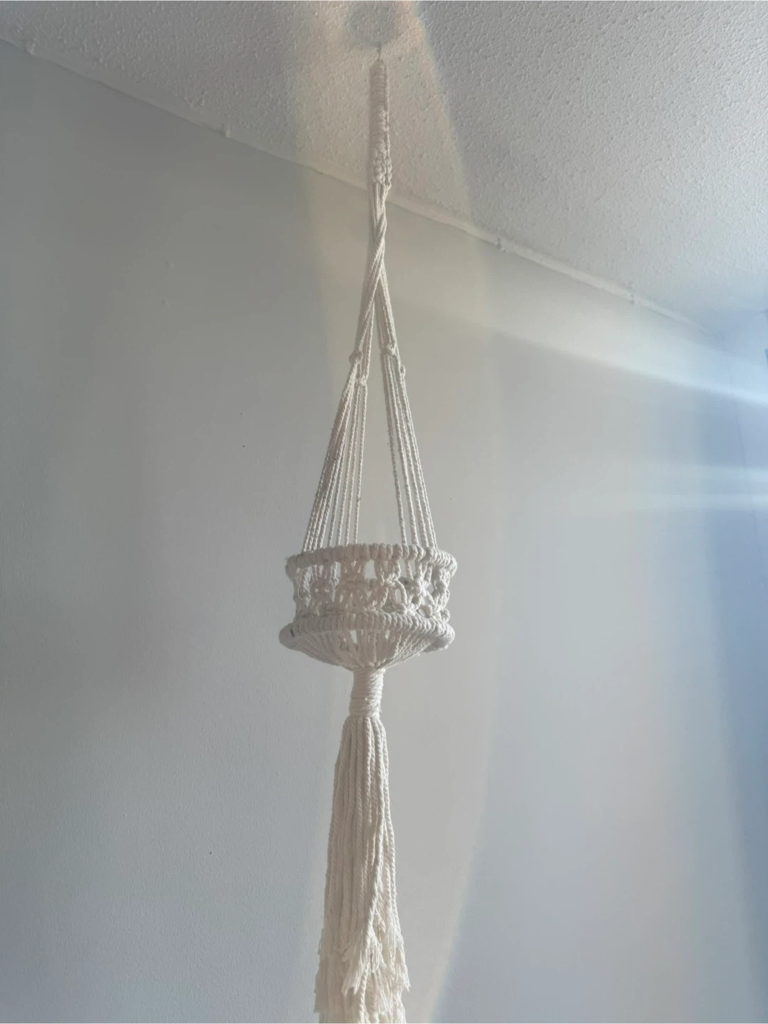Add a touch of boho charm to your home with this macrame plant hanger! It's perfect for displaying your favourite plants and adding a cozy vibe to any room. It's in great condition and ready to find a new home!