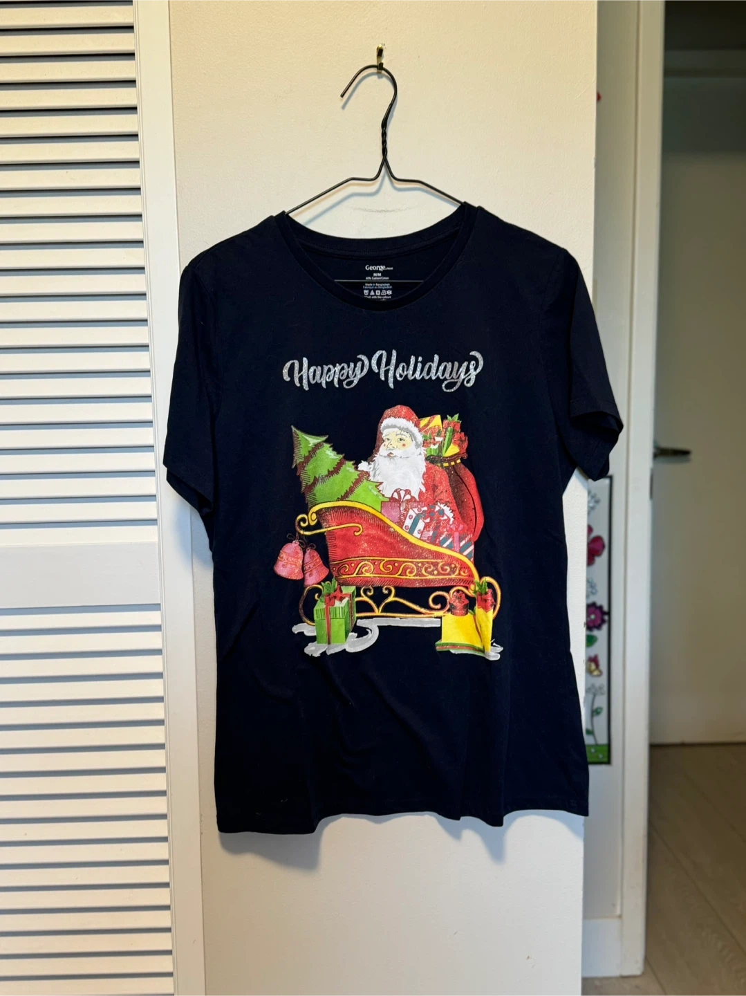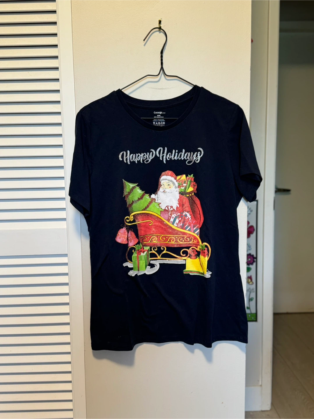 Here's a George brand T-shirt. It's a navy blue colour with a fun 'Happy Holidays' graphic featuring Santa in his sleigh! Great for the festive season.