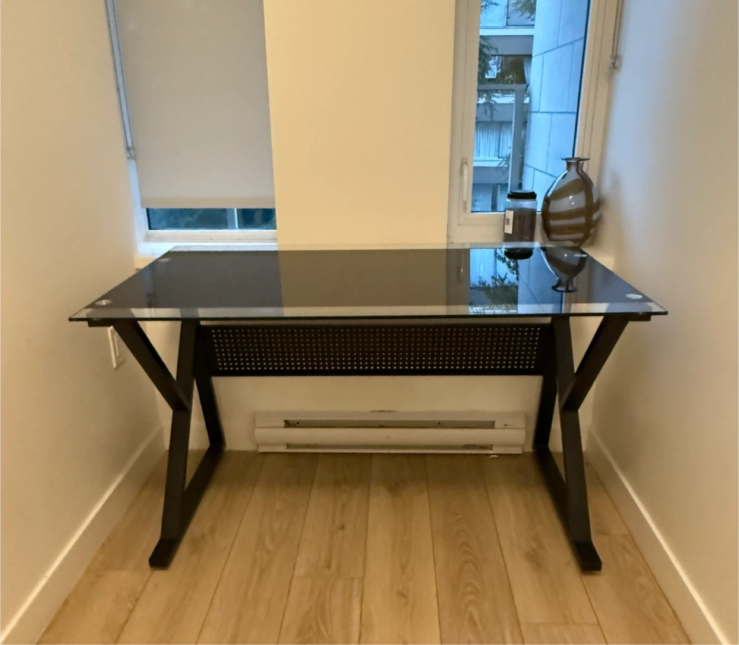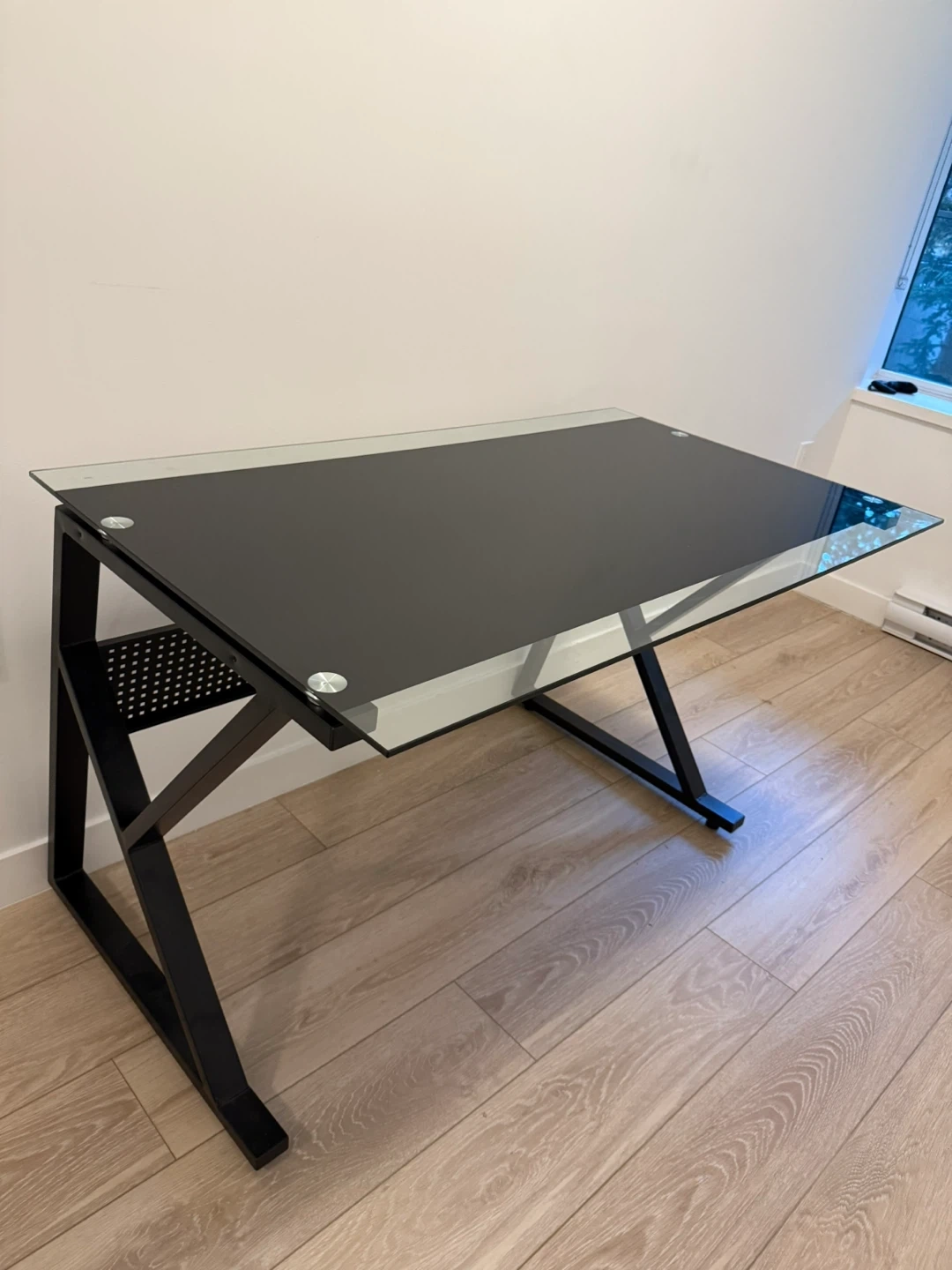 Selling a sleek black desk with a glass top! It's in great condition and would be perfect for a home office or student. The frame is sturdy and the glass is easy to clean. It has a unique, modern look that would fit well in any space.