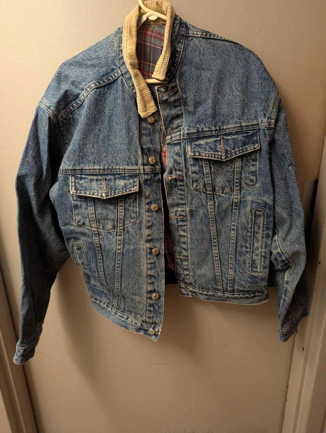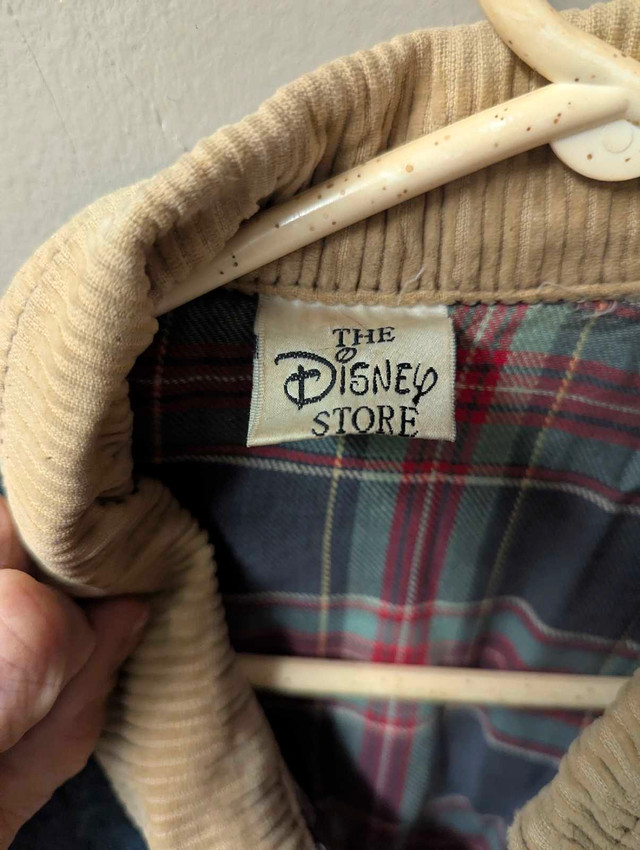 This is a fantastic, used Disney Store denim jacket perfect for any Disney fan! It features a cool denim exterior with a plaid lining and a corduroy collar. It's in good condition, ready for a new home. Features: * Brand: Disney Store * Material: Denim with plaid lining * Collar: Corduroy Has Disney characters on the back. OBO