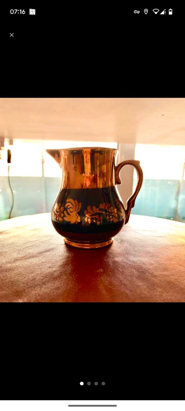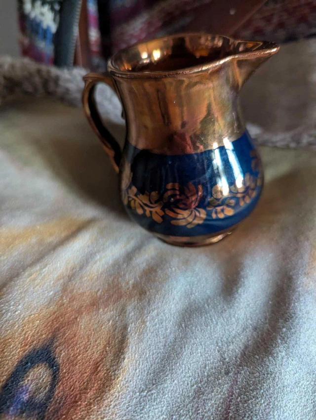 This is an antique copper lusterware pitcher, likely made in England between 1820 and 1850. It features a metallic copper glaze over a dark blue band, adorned with hand-painted or transfer-printed floral designs.