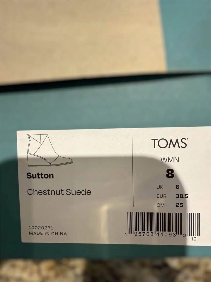 Buy & SellNew - chestnut brown suede TOMS Sutton wedge booties - size 8New - chestnut brown suede TOMS Sutton wedge booties - size 8$40TOMS wedge booties, chestnut brow. New in box, with tagsWHERE TO MEETCheck LocationView MapSELLERCandaceCooksville381 review0 chats·0 favorites·6 viewsSEND CHAT TO SELLERHi Candace! I’m interested in your listing.Hi Candace! I’m interested in your listing.Get the Karrot app to chatSign In to chat