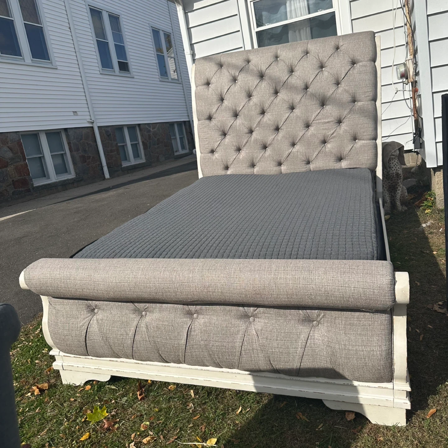 75Selling a queen-sized upholstered sleigh bed frame. The headboard features a button-tufted design, and the frame is a neutral gray color. It's in good condition and ready for a new home!
