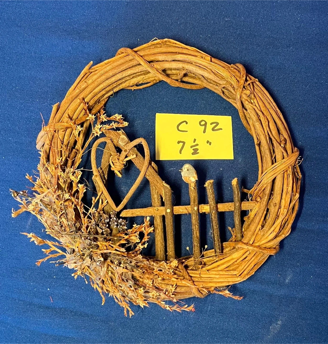 Selling a cute handmade wreath! It features a little heart and a tiny bird on a fence. The wreath is about 7.5 inches in diameter.
