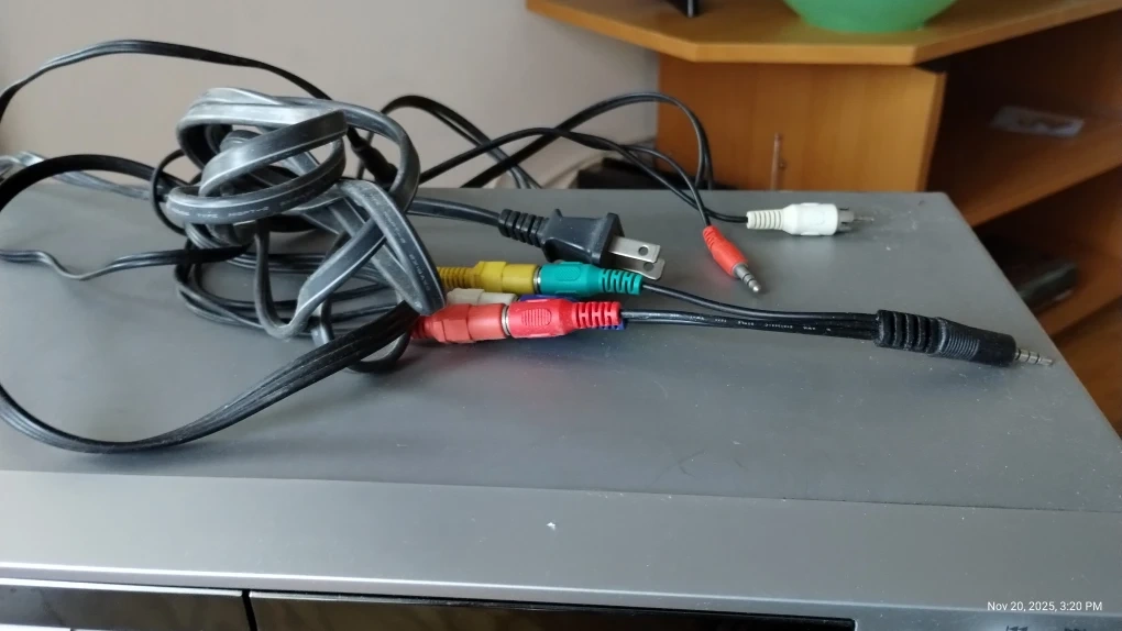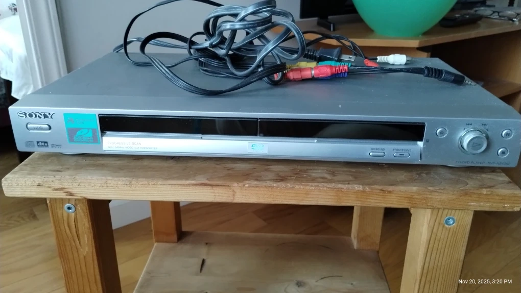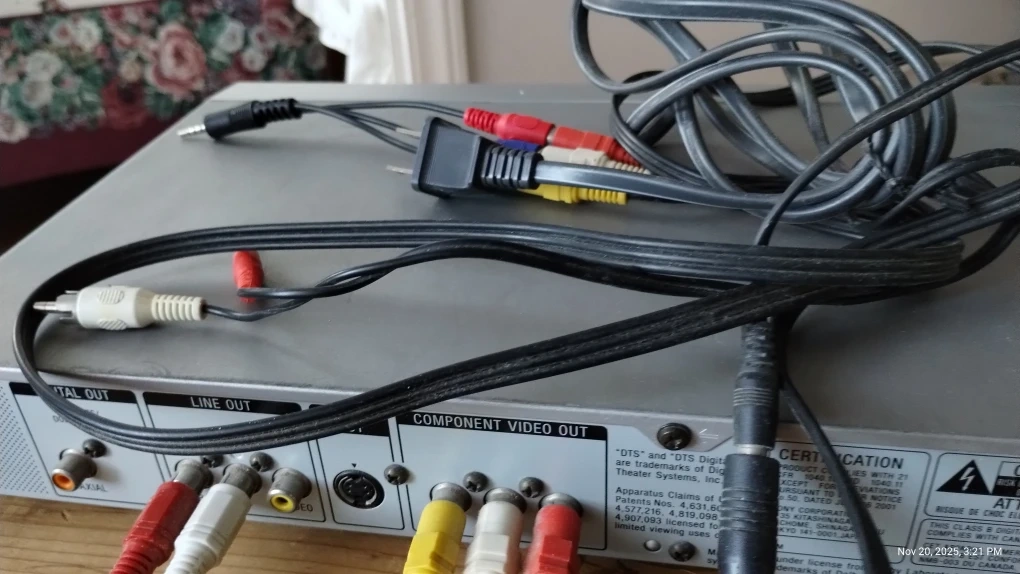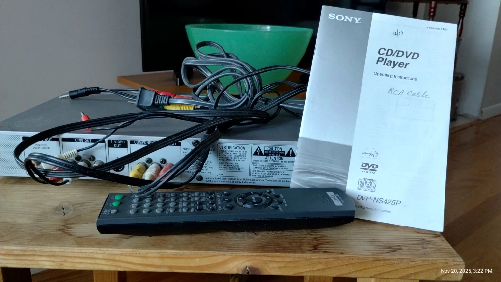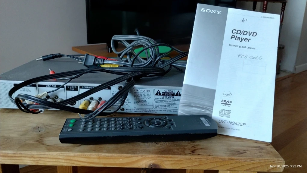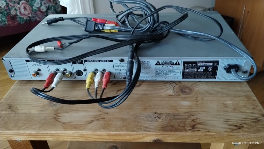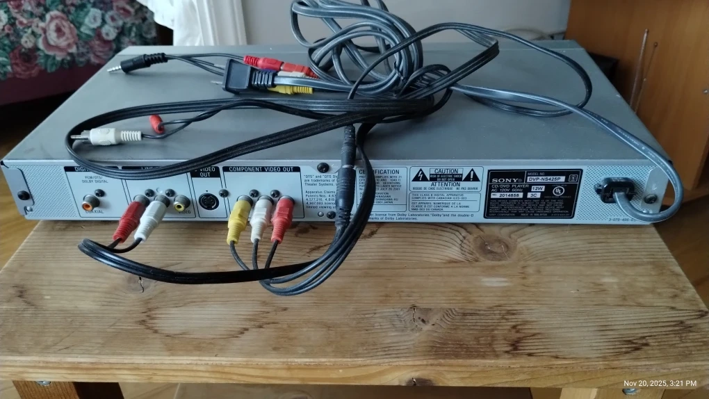 Sony CD/ DVD Player in Silver color with all power cords, remote and operating instructions in good working condition. All the cables are already connected to the backside of the player in their appropriate ports. Just have to connect the cables to your TV ports. Very easy.