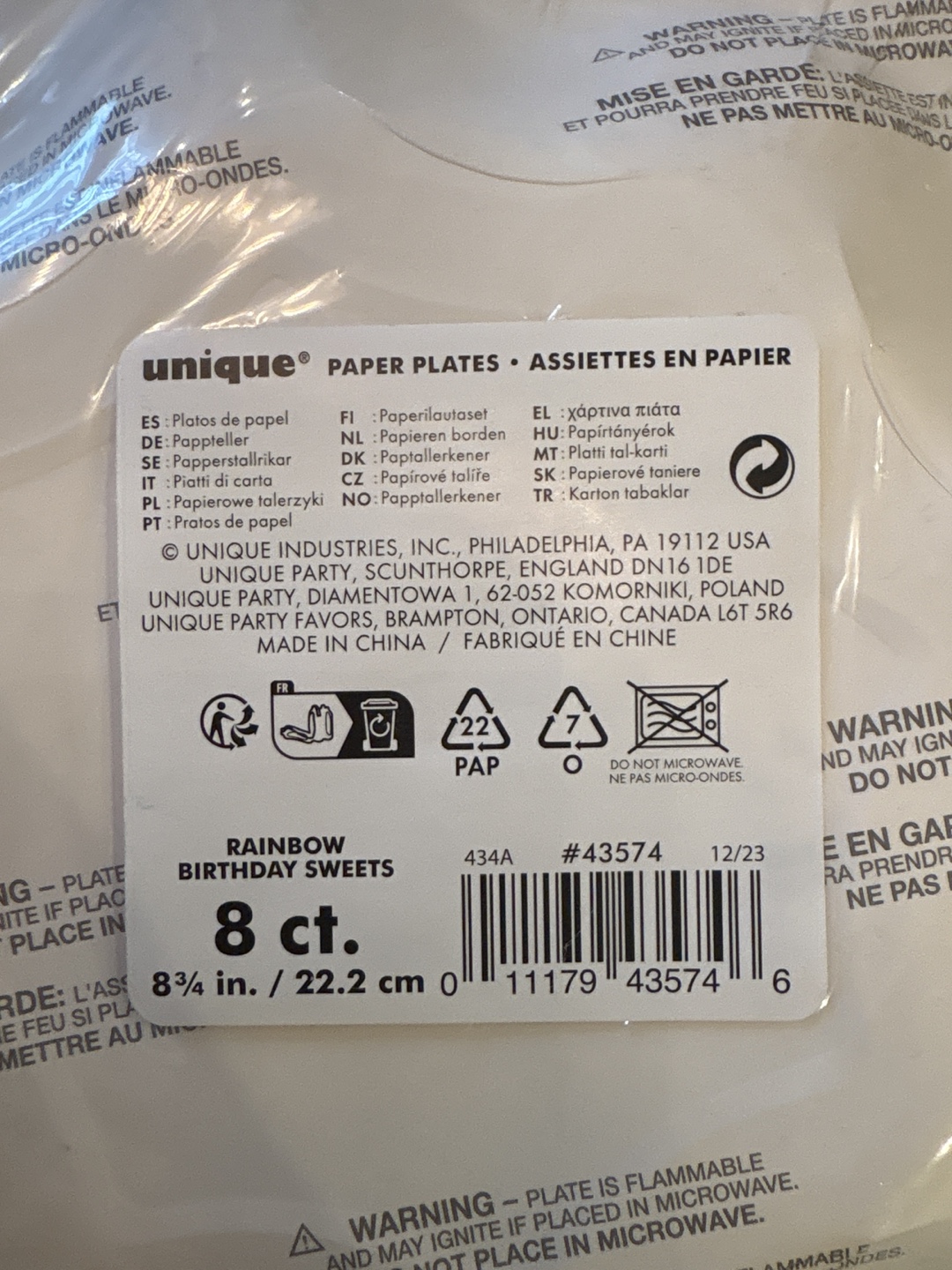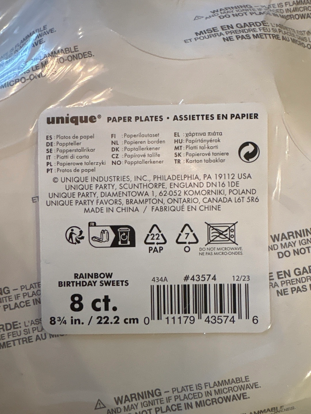 Selling a pack of Unique brand paper plates, perfect for a birthday party! They feature a cute 'Rainbow Birthday Sweets' design and come in a pack of 8. Each plate measures 8 3/4 inches (22.2 cm).