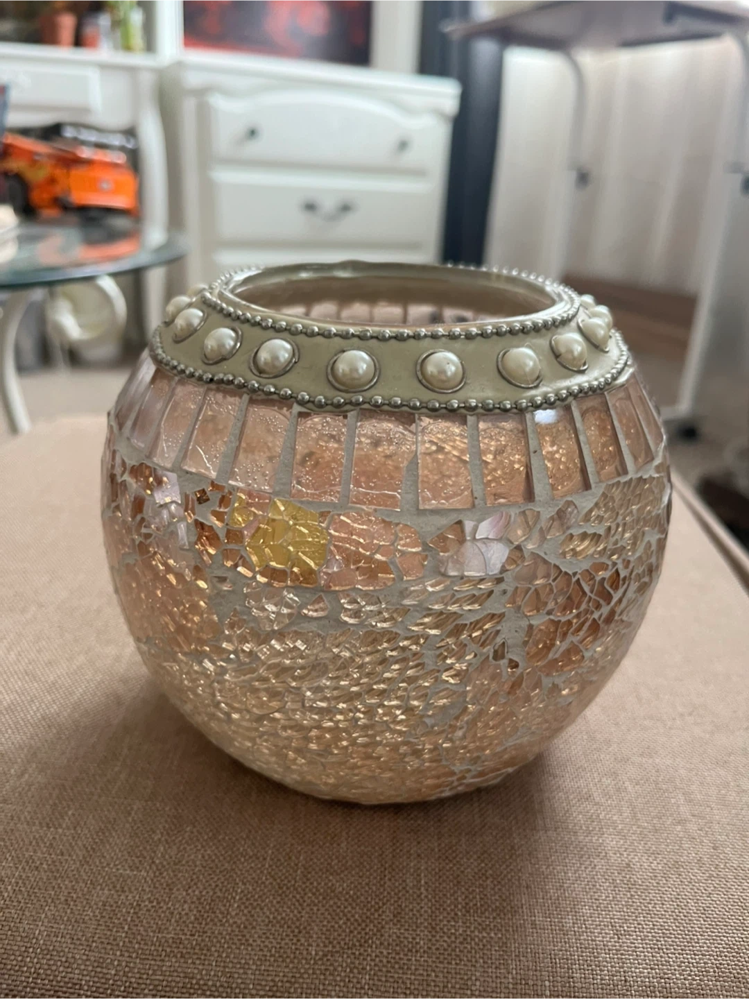 20Selling a beautiful mosaic glass candle holder. It has a lovely design with pearl-like accents around the rim. It would look great as a decorative piece in any room!