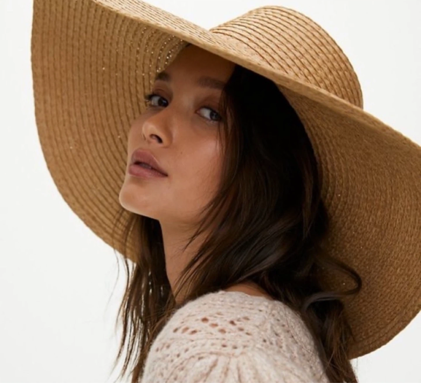 Aritiza Hamptons classic wide-brim sun hat in tan. Ideal for adding flair to your look. A must-have accessory for sleek elegance. One size but adjustable from inside with interior ribbon.