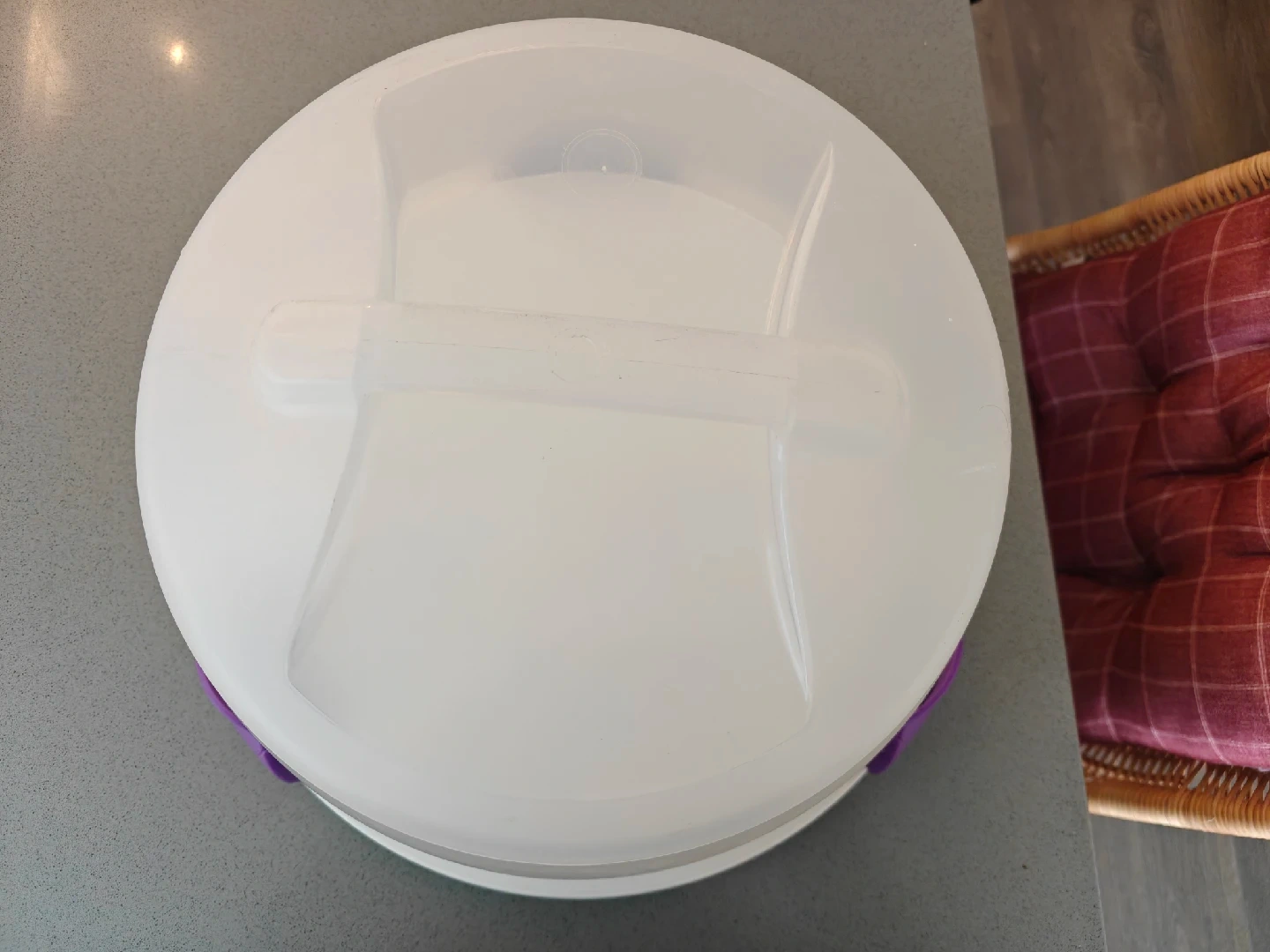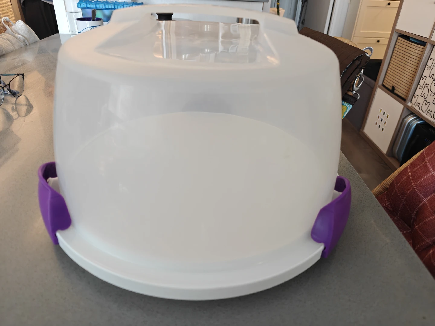 Selling a cake carrier that's in great condition! It's white with cute purple accents. Perfect for transporting your baked goods safely and stylishly. It's sturdy and ready for its next baking adventure