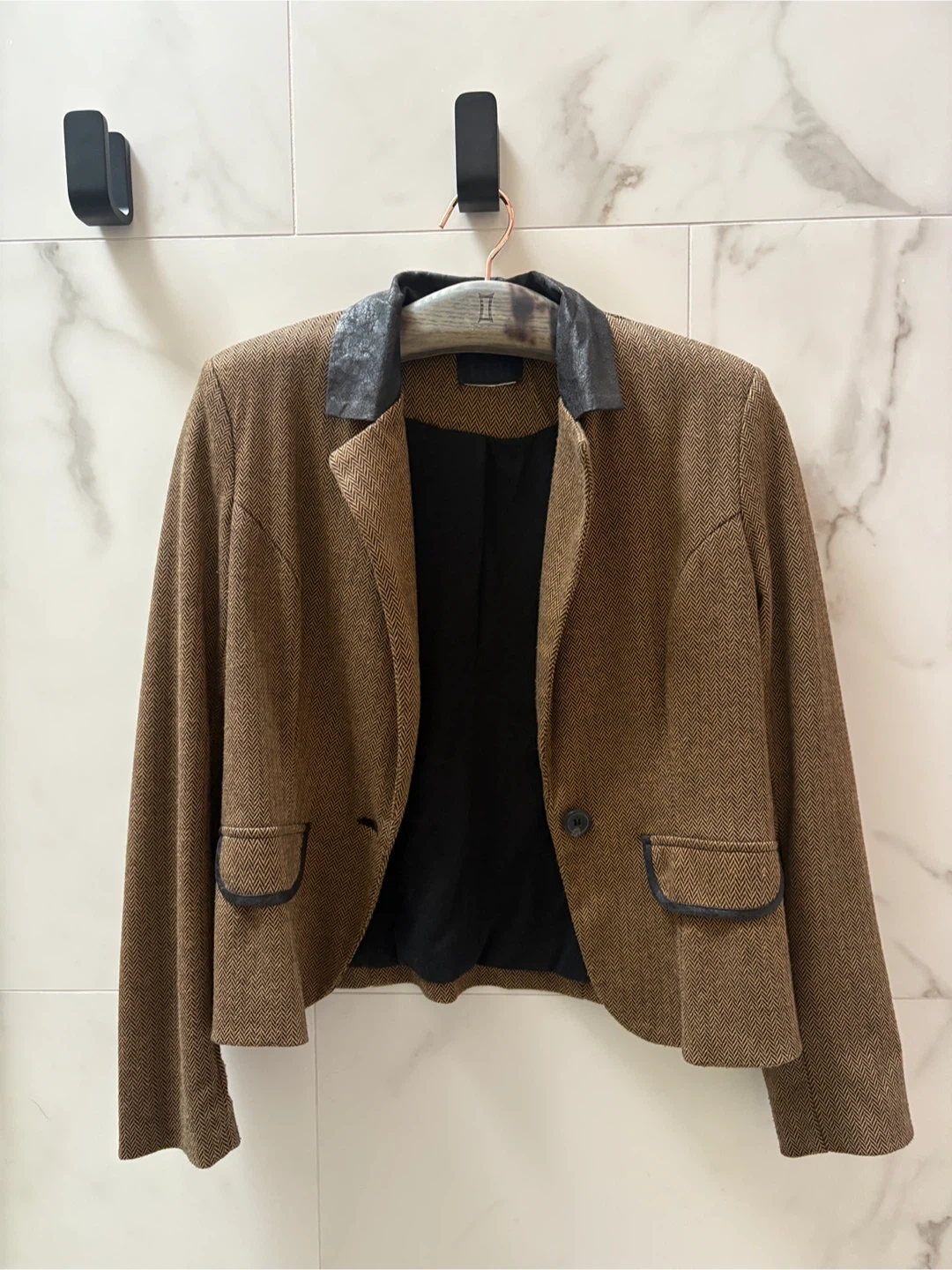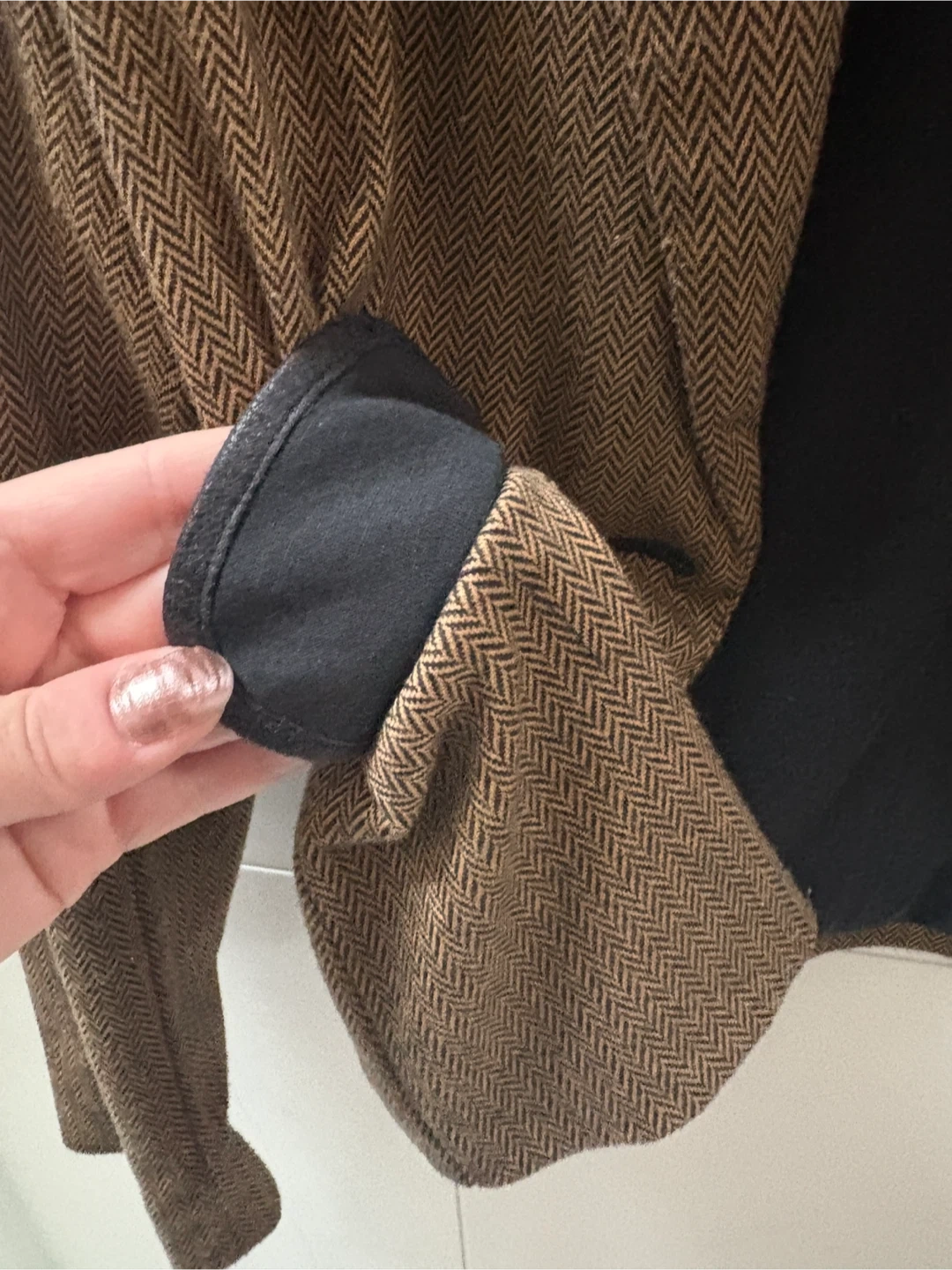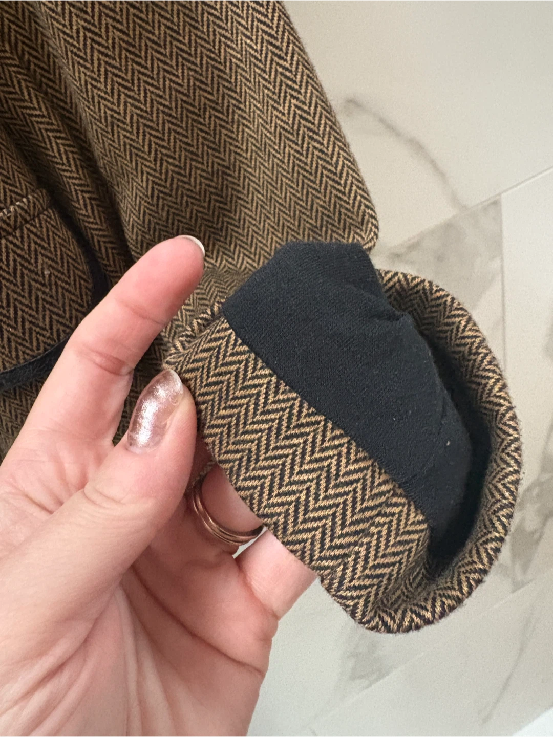Selling a stylish hand-sewn brown herringbone blazer from former Queen street East store HUH. Beautiful unique pattern and black accents on the collar and pockets. High quality, I cut off the tag but it has wool in it! Size Small.