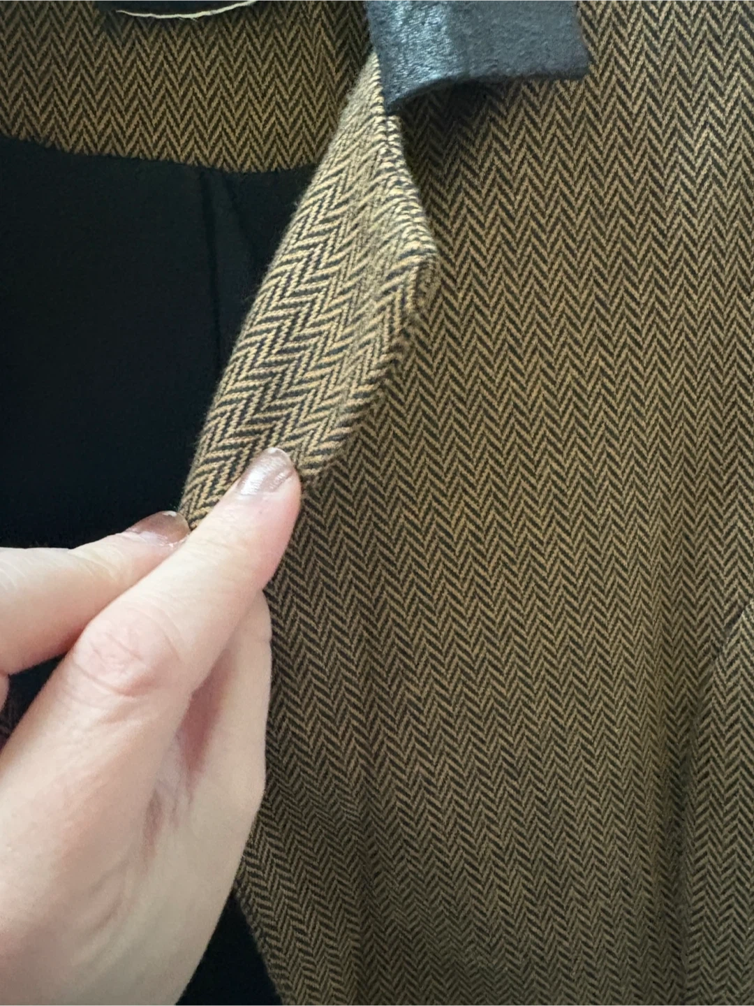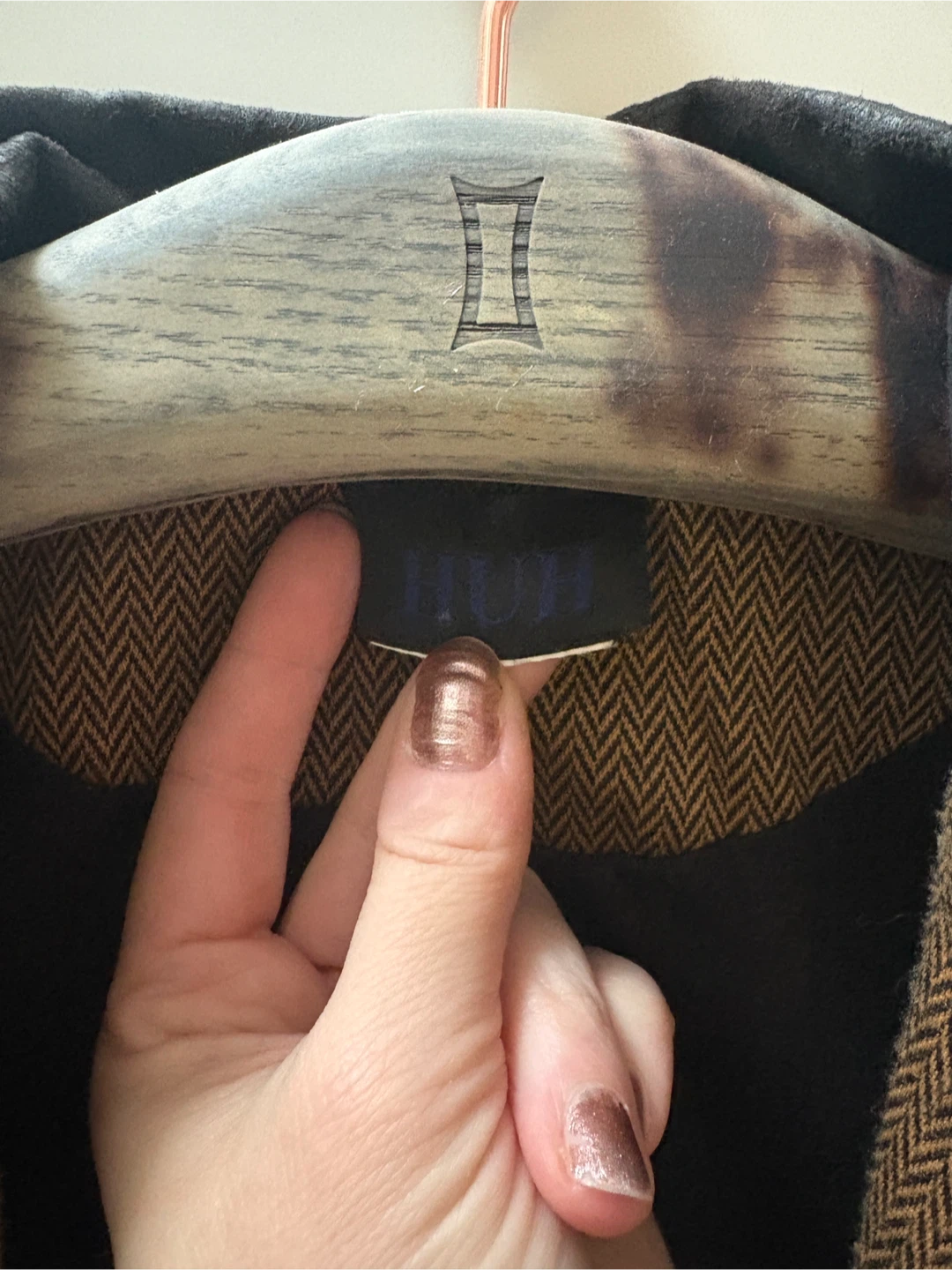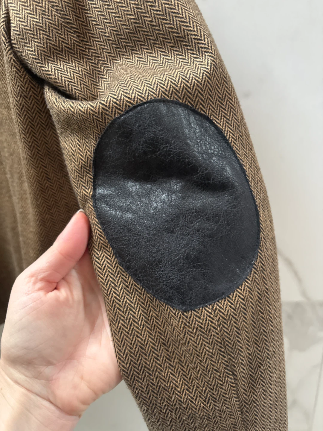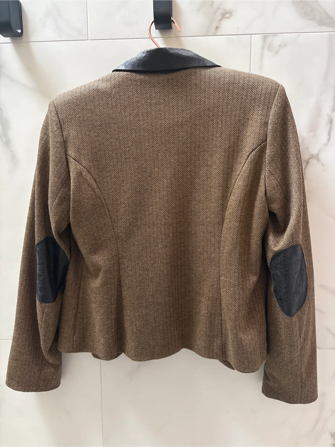 Selling a stylish hand-sewn brown herringbone blazer from former Queen street East store HUH. Beautiful unique pattern and black accents on the collar and pockets. High quality, I cut off the tag but it has wool in it! Size Small.