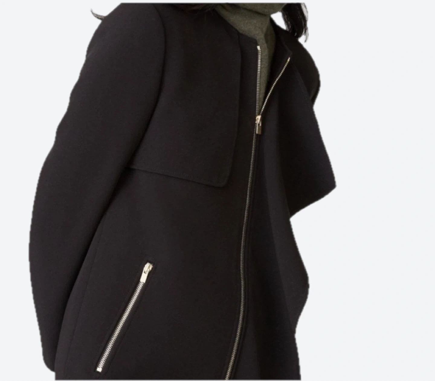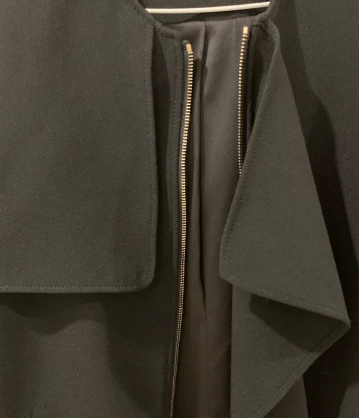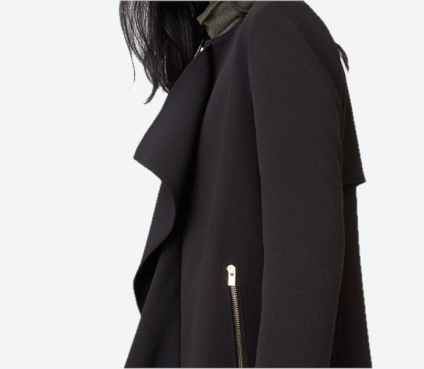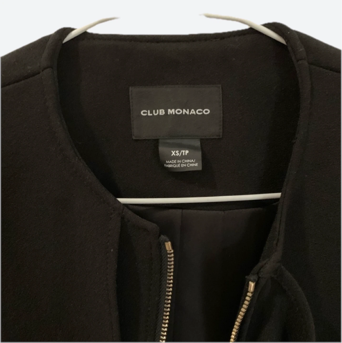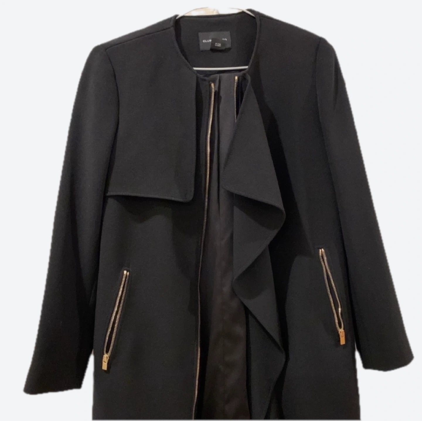 Sleek and modern design. Features a collarless style. Side pockets with zipper. Perfect for versatile wear. Lightly worn.